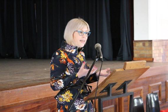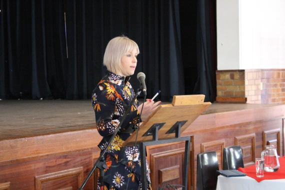 Afterwards, Ms. Karyn Maughan (Author, and Award-winning Broadcast, Radio and Print Journalist) gave a speech on the topics of freedom of expression, pitfalls of social media as well as cyberbullying but also the potential of social media to facilitate activism and positive change. With the help of visual content in forms of videos, pictures and quotes from Twitter, Ms. Karyn Maughan informed the learners about the role and presence of social media while she reflected upon her personal but also other’s Social Media personality.