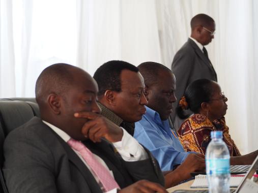 The addressees listen attentively and take notes. F.l.t.r.: Hon. Sarah Ng'wani (Deputy Mayor Ilemela Municipality), Daniel El-Noshokaty (KAS Resident Representative Tanzania), Hon. Luhaga Mpina (Vice President's Office, Union and Environment, Deputy Minister), Dr. Ally-Said Matano (Executive Secretary, EAC Lake Victoria Basin Commission).