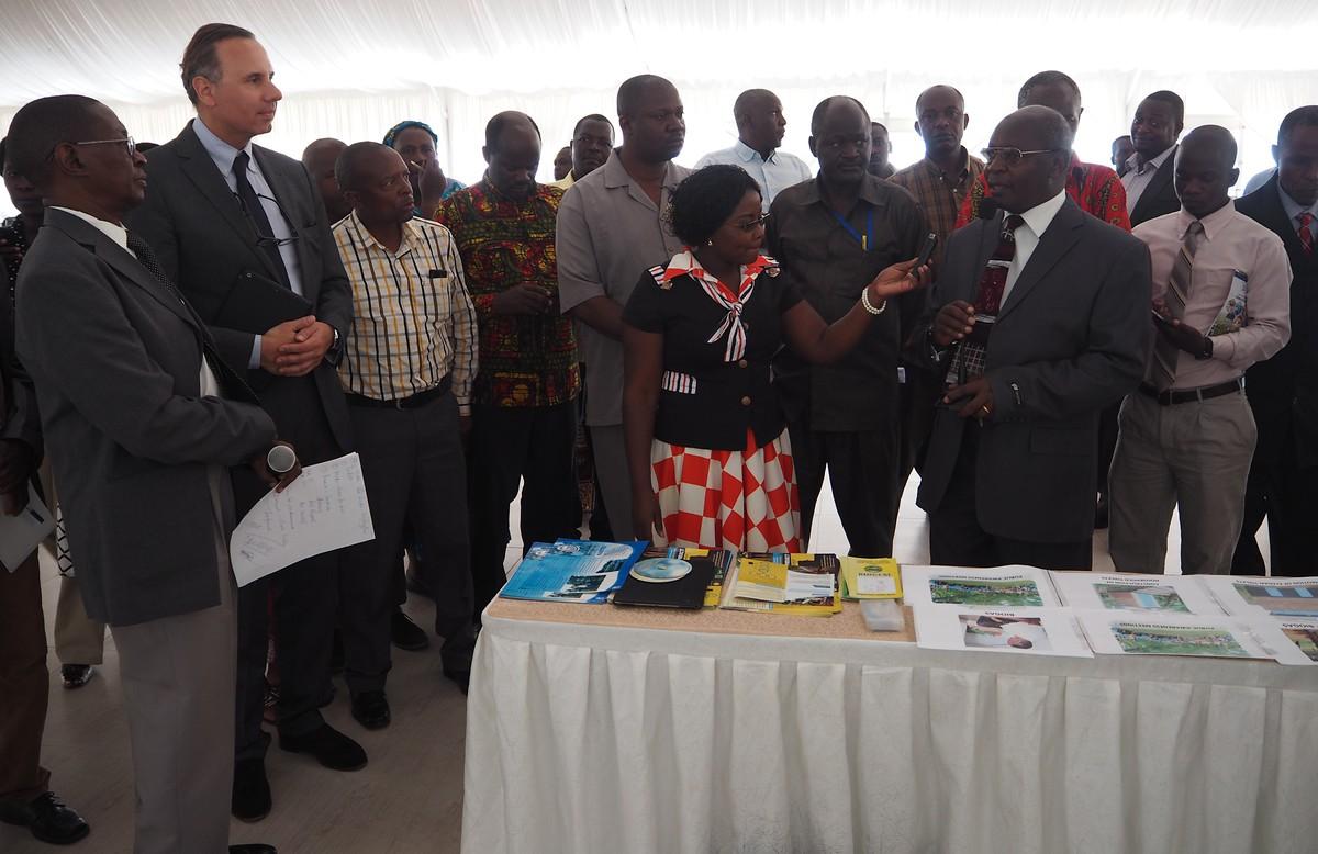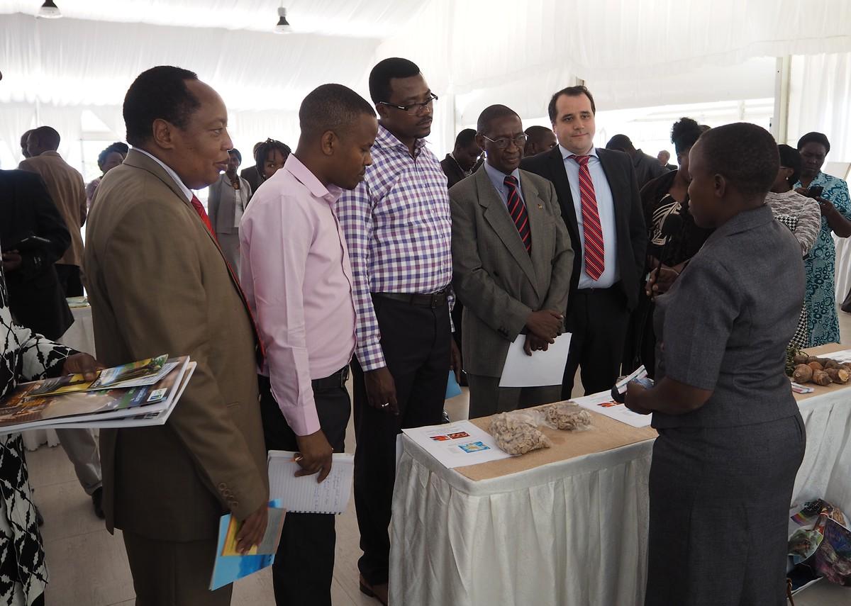 Hon. Luhaga Mpina and Dr. Ally-Said Matano visit the environmental exposition; here together with the personal assistant of the minister Ibrahim Mdee, Richard Shaba (KAS) and Daniel El-Noshokaty (KAS).