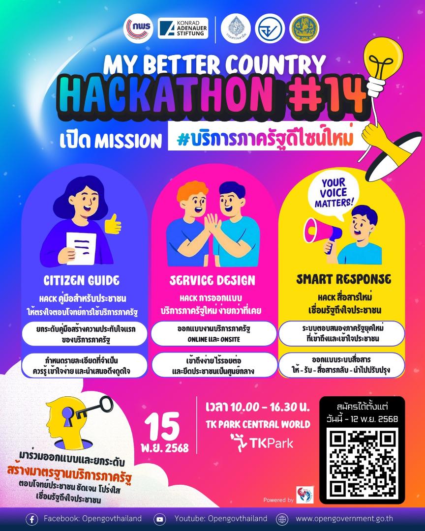 The 14th MY BETTER COUNTRY HACKATHON organised by the Office of the Public Sector Development Commission (OPDC) with the support of KAS will gather public opinions on approaches to national development, aiming to encourage the participation of citizens and relevant sectors in expressing their views on national-level issues related to public sector reform that are of social interest. This activity will promote a participatory public administration system involving the government, private sector, civil society, and other stakeholders, turning participation into tangible outcomes. Ultimately, this will lead to improved governance in accordance with the principles of good governance and foster greater public trust in the government.
