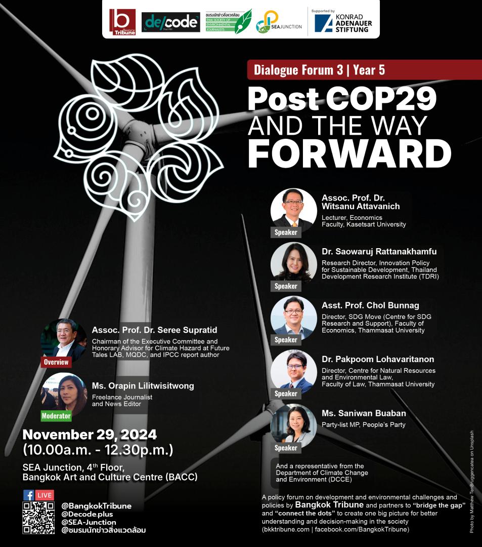 Realising what the outcomes of this COP mean to the future of the planet and people, including Thai citizens, the Dialogue Forum would cordially like to invite you to take this opportunity to explore COP29 and the way forward together in the Dialogue Forum 3 of Year 5: Post COP29 and the Way Forward at SEA-Junction, 4th Floor, BACC.