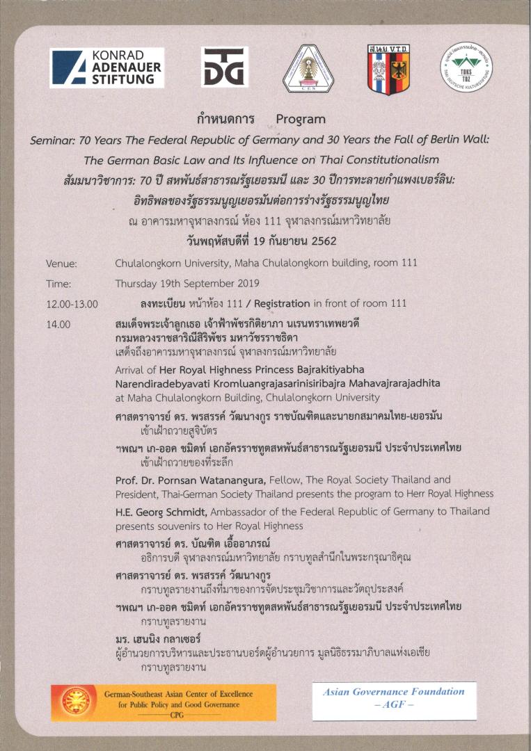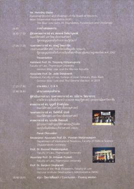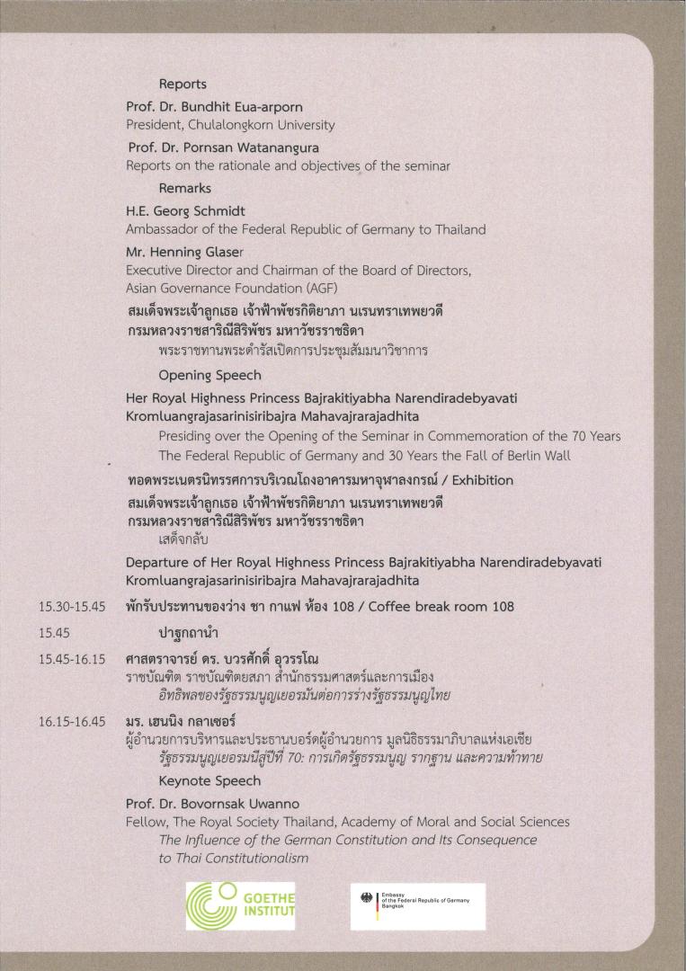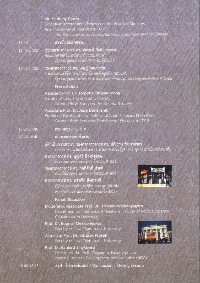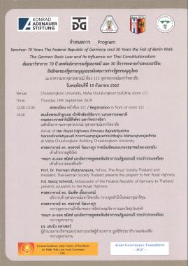 In order to point out the comparative interdisciplinary aspects, the seminar assembled many highly proficient Thai experts in constitution law and background to lecture and discuss on the influences of the German constitution, which is known as ‘German Basic Law’, on the drafting process of the Thai constitution as it is realised that the German constitution remarkably influenced the 1997-version of the Thai constitution as well as to differentiate the historical backgrounds of both countries which have caused and shaped the current states of constitutionalism.