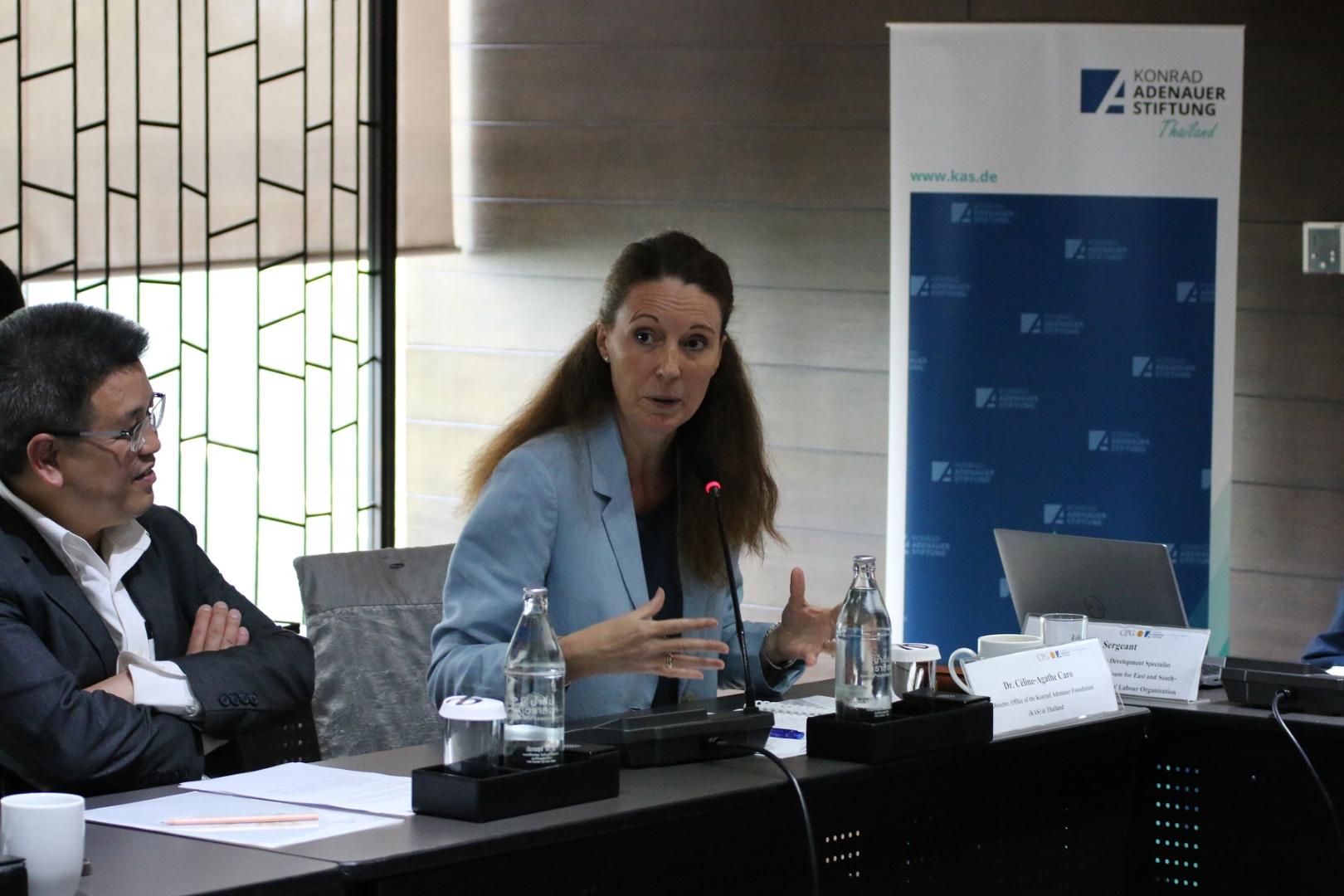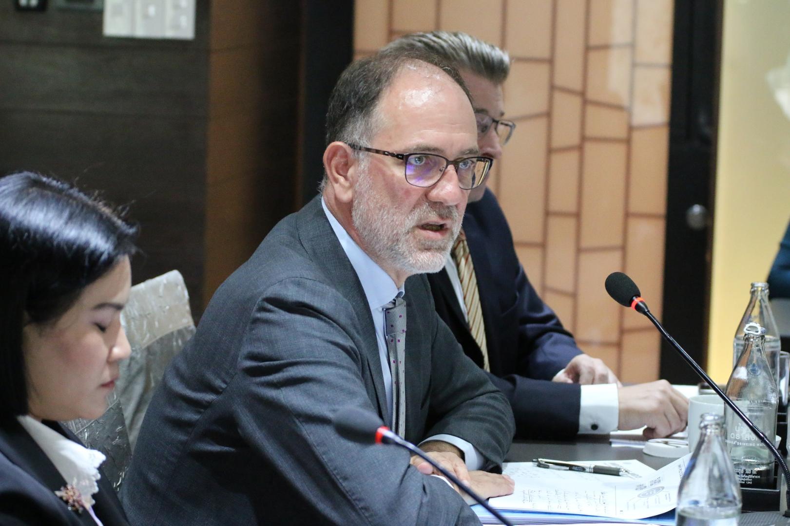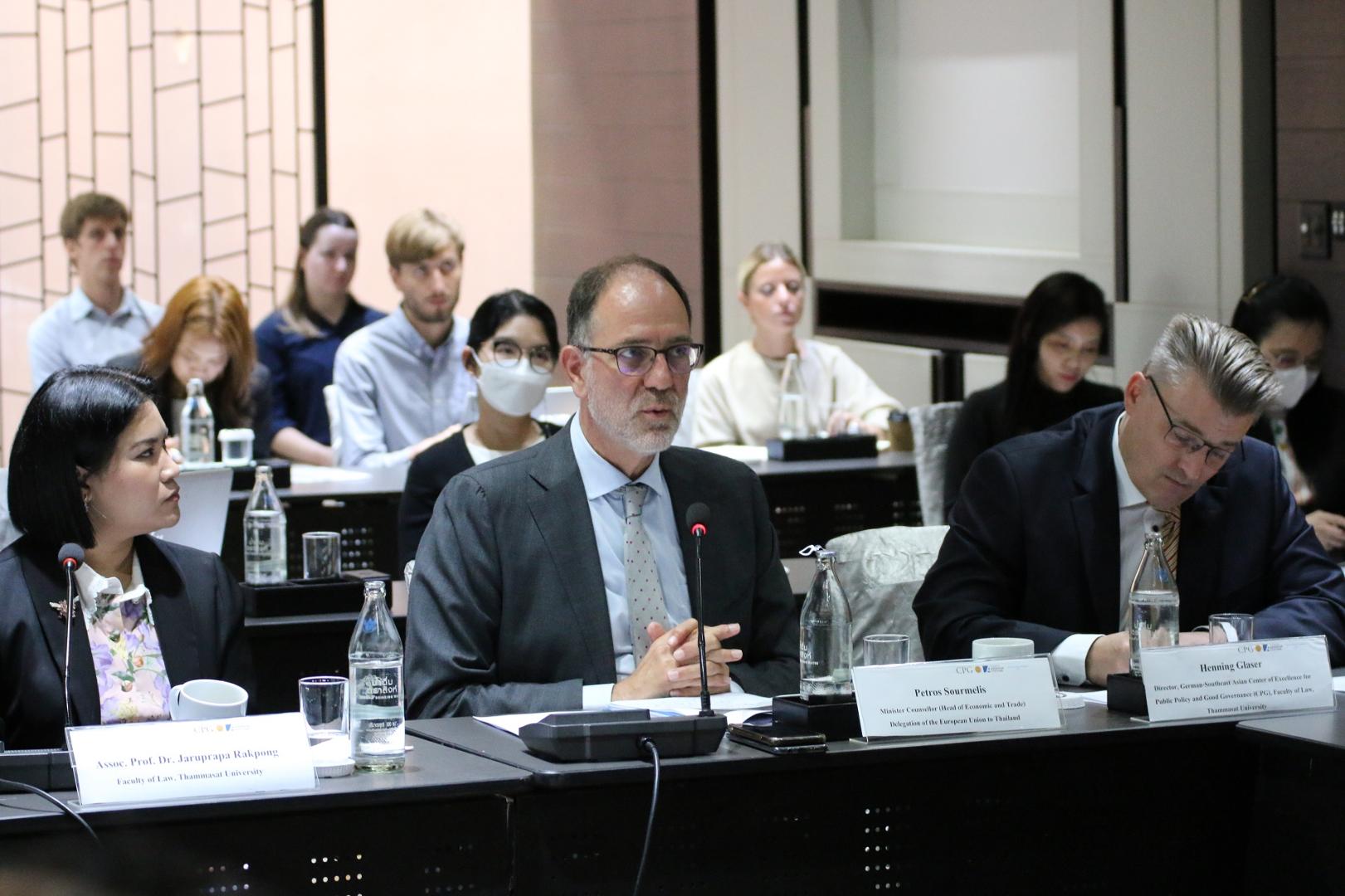 The seminar, which took place under Chatham House rules, featured three speakers: Mr. Petros Sourmelis of the EU Delegation to Thailand, Mr. Kelvin Sergeant of the International Labour Organization, and Mr. Henning Glaser of the German-Southeast Asian Center of Excellence for Public Policy and Good Governance, moderated by Assoc. Prof. Dr. Jaruprapa Rakpong from the Faculty of Law at Thammasat University. Participants in the audience hailed from various backgrounds such as international organizations, civil society, government agencies, media outlets, foreign embassies, academia, and the business community.
