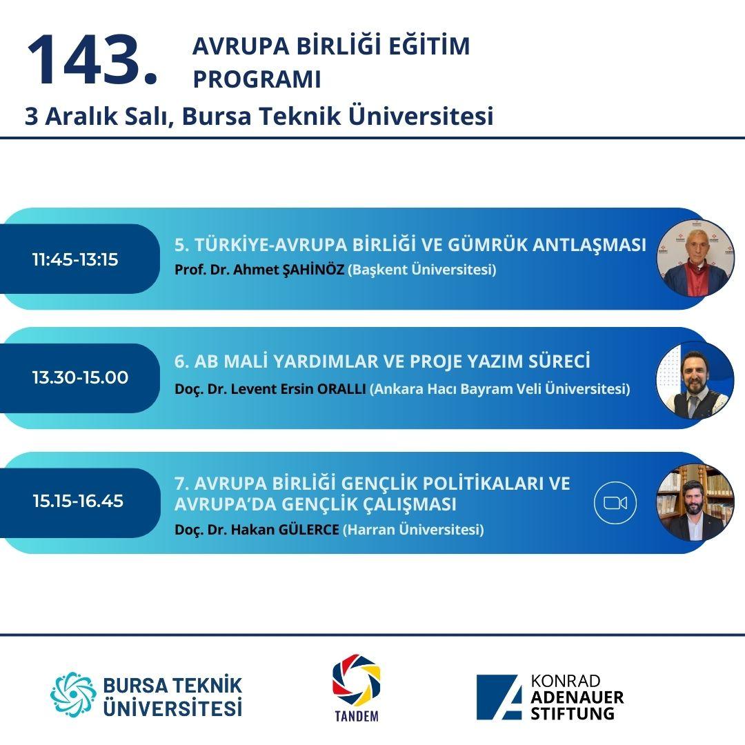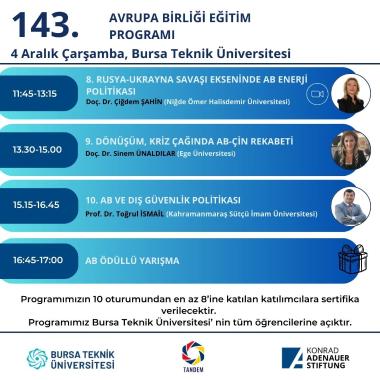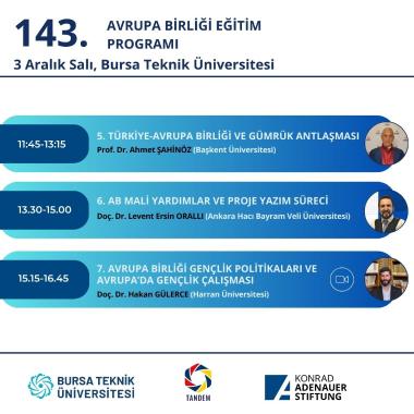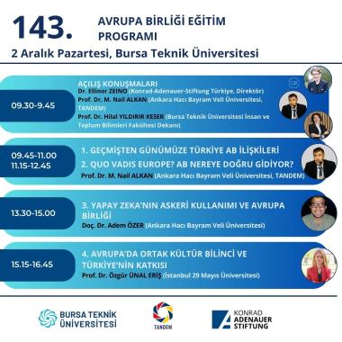 The 143. EU Education Program is implemented in partnership between the Konrad-Adenauer-Stiftung Türkiye, TANDEM, and Bursa Technical University from December 2 to December 4, 2024.