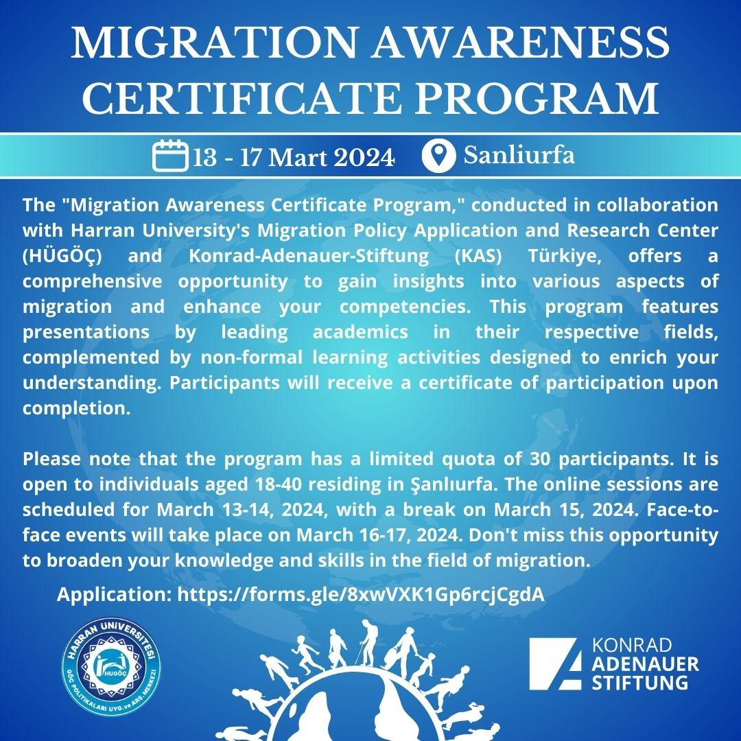 The Migration Awareness Certificate Program in cooperation with the Migration Policy Application and Research Center (HÜGÖÇ) of Harran University and the Konrad-Adenauer-Stiftung (KAS) Türkiye offers a unique opportunity to deepen knowledge and acquire skills in the field of migration.