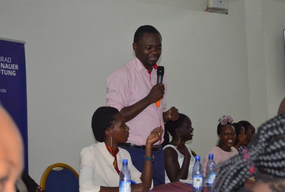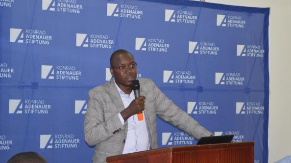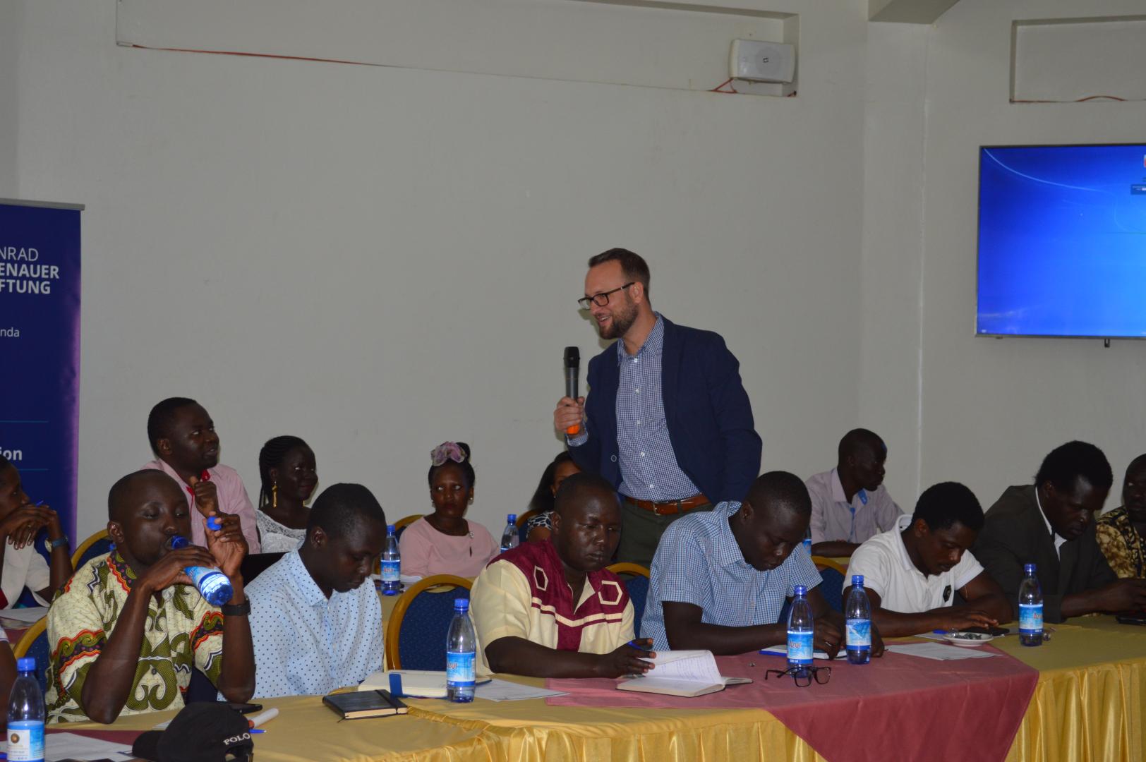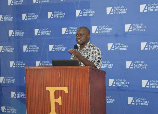 In his welcoming remarks, Mathias Kamp, Country Representative of KAS, highlighted the importance of social protection floors in the context of the principles of a social market economy, one of the main objectives of KAS' work in Uganda. "When we look at social protection floors, we look at the core of what social market economy is designed for – a society, where the individual is not left behind." Moreover, he encouraged the audience to further engage in networking and emphasised the relevance of creating a platform for intellectual capacity and exchange, particularly for distant learning students. The high academic level of the scholarship programme, Mr. Kamp predicated, provides scholars with a fundamental basis to be at the forefront of bringing solutions to the current developmental challenges that we are facing.