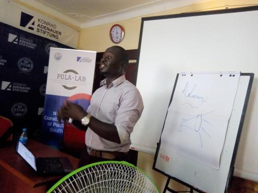 The POLA-LAB South Sudan which will run in series of two days each month for five months brought together about 30 Youth leaders working with communities, civil society organizations and students from high institutions of learning. The training covered topics such as Democracy facilitated by David Kaunda program manager CEFoRD, Political Economy Analysis and Advocacy by Ojok Okello Programme Officer KAS, Policy Development steered by Wani Michael of Okay Africa Foundation.