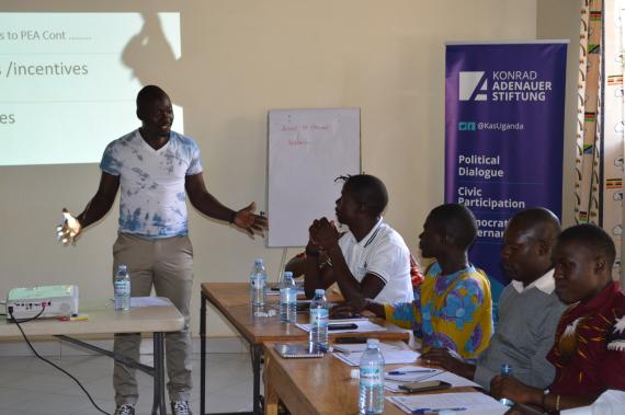 Ayub Kiranda, the programme manager at the University Forum on Governance, started the first session by giving an introduction on the topic of economy analysis. He explained that economy analysis provides an understanding of the relationship between politics and economics and of the actors, interests and resources which must be taken into consideration. Donnas Ojok, the programme manager of KAS, emphasized that economy analysis contains not only economic interests but above all most importantly power dynamics by the various stakeholders involved. After all economy analysis is a tool of great significance since it enables young leaders to understand how to engage and mobilize stakeholders and how to use power and resources for advantage.