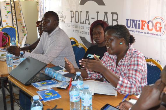 Advocacy and lobbying were discussed with the participants in the last place. Donnas Ojok, the facilitator of this session, described advocacy as one of the most important tools citizens have, to participate in governance. It is an effective device for influencing and shaping public aims at bringing empowerment and positive change. Advocacy can occur in various forms - think tanks and research were named as key terms. To make advocacy work, the striking emphasis was on the need of an advocacy strategy which has to contain four components: identifying and defining the problem, the actors, the approaches and finally the solution and the purpose. To apply the just gained knowledge the participants got the task to create an advocacy plan. Each group had to think of a problem which affects the majority of the population and to create an appropriate solution. The participants came up with strategies dealing with the issues of street children and garbage collection.