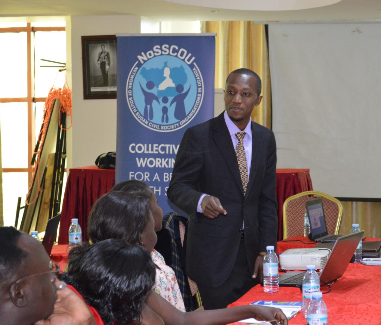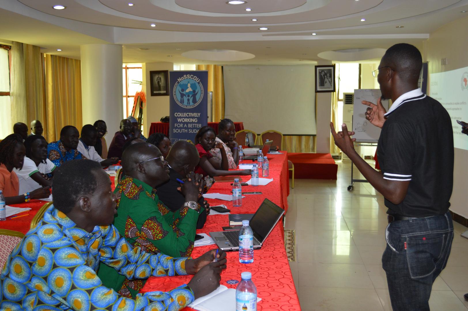 The Training was officially opened with warm welcoming remarks by Ayoo Irene, NoSSCOU representative. Mr. Isaiah Eitu, Executive Director of African Centre for Conflict Resolution and the main facilitator of the morning session, took over by giving a brief introduction to the basic concepts of conflict management and conflict resolution. First, he defined a conflict as an action that arises from pursuit of opposite interests between two or more parties, which can either be personal or in a group. A conflict does not just happen in an instant, it passes through certain levels. He explained that conflict emerges from a simple discomfort - "Things just don’t feel right but you don’t know why?" - to misunderstanding and tension and eventually ends in the final crisis.