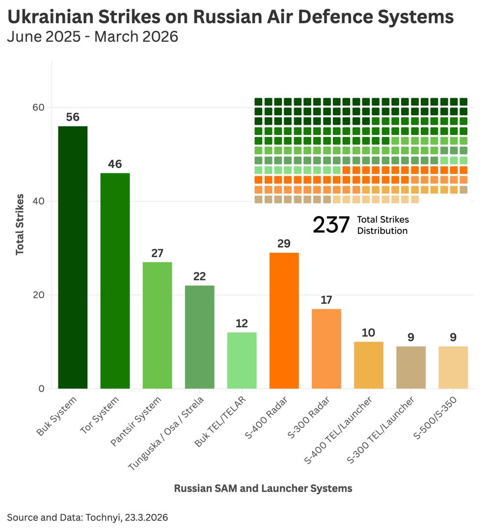 Ukraine has concluded that the protection of its cities and critical infrastructure cannot rely solely on globally scarce air defense assets. Degrading Russian strike capabilities is therefore assessed to be more cost-efficient and effective than exclusively intercepting incoming aerial threats (↗ Tochnyi, 23.3.2026).