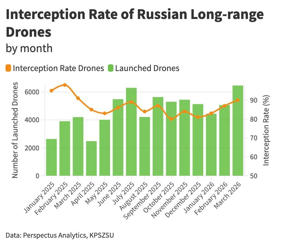 The interception rate in drone defense continued to rise in March. Over the past year, interception rates had fallen to between 80 and 87% during the sharply increasing drone attacks. Now this key indicator has risen again to 90%—an important trend reversal. The previous peak was 97% in February 2025.