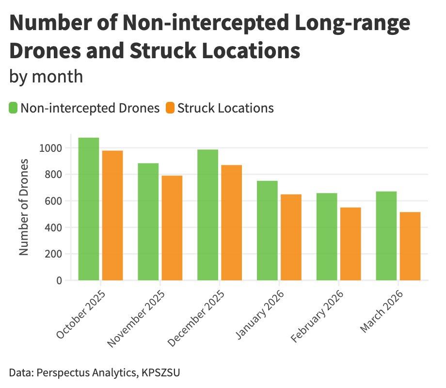 At the same time, Russian attacks using long-range drones—although deployed in continuously higher numbers—did not cause greater destruction. Due to improved interception rates, the number of non-intercepted drones declined from October 2025 (1,077) to 671 in March. If only those drones that actually reached a target are considered, the trend becomes even clearer: Ukrainian Air Force daily reports indicate a decrease in reported strike locations from 979 in October to 515 in March.