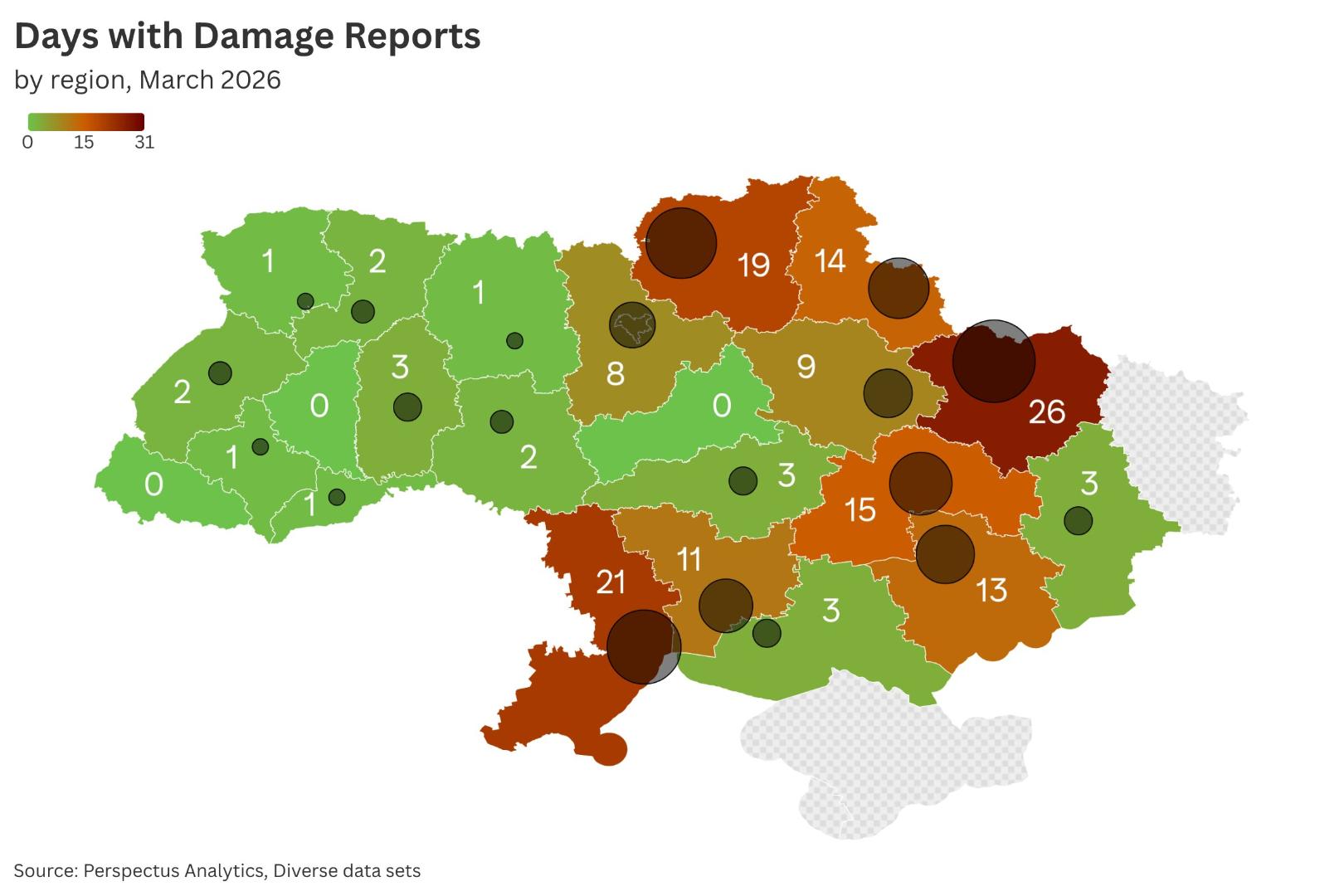 Unlike in the previous autumn and winter, the attacks by the Russian army are now once again more widely distributed. In March, far more Ukrainian regions were affected than in previous months. In the daily damage reports, affected regions were mentioned a total of 160 times in March—the highest figure since October 2025.
