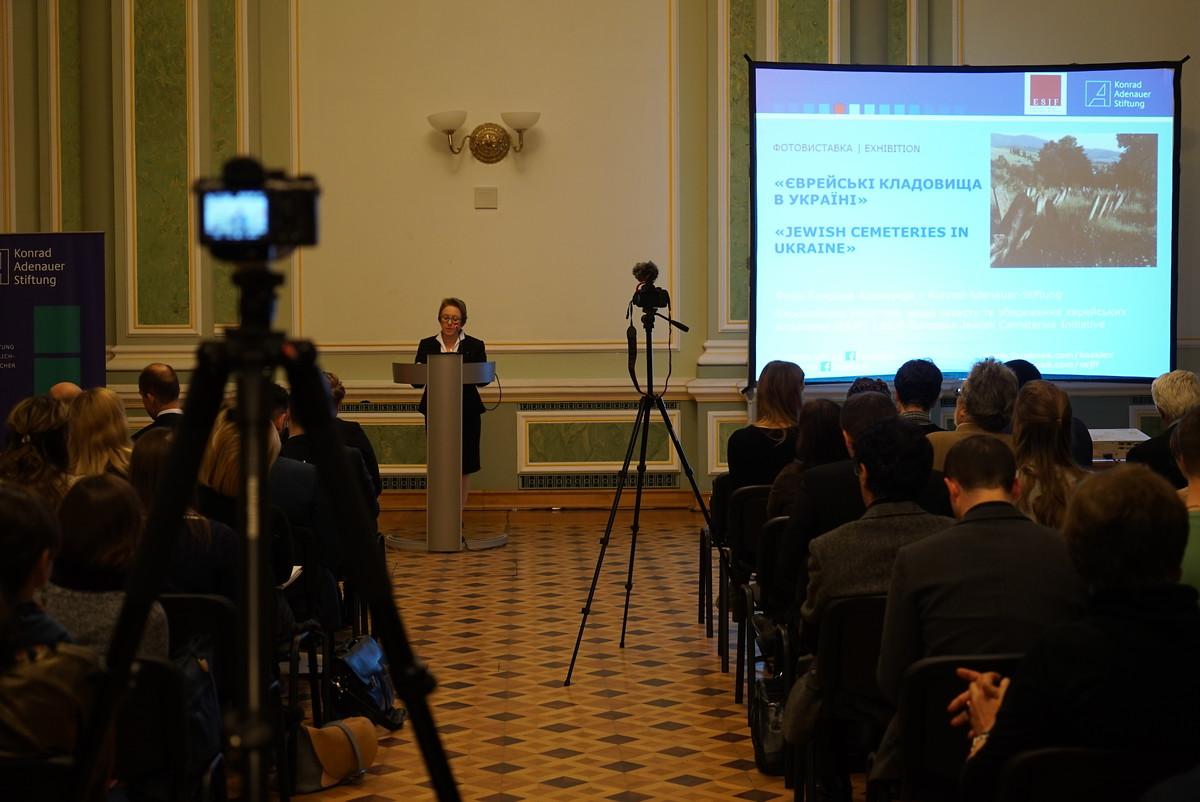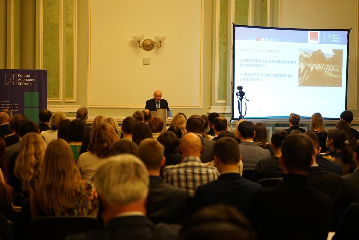 Der stellvertretender Generalsekretär und Leiter der Hauptabteilung Europäische und Internationale Zusammenarbeit der Konrad-Adenauer-Stiftung Dr. Gerhard Wahlers betonte in seiner Eröffnungsrede, dass sich die Konrad-Adenauer-Stiftung nach dem Vorbild ihres Namensgebers seit langem für die Intensivierung der deutsch-israelischen Beziehungen und die Zusammenarbeit mit jüdischen Organisationen weltweit einsetzt. Dieses Engagement und die starken Partnerschaften zeigen sich beispielhaft im Projekt „Restaurierung jüdischer Friedhöfe in Osteuropa“, bei dem die ESJF European Jewish Cemeteries Initiative und die Konrad-Adenauer-Stiftung zusammen mit VAAD Ukraine und der Unterstützung des Auswärtigen Amtes im Jahr 2015 27 jüdische Friedhöfe in der ganzen Ukraine restauriert haben. Die Ausstellung führt die Erfolge vor Augen, die mit der Restaurierung der Friedhöfe erzielt wurden, welche oft noch vor kurzem von Wald überwachsen waren oder als Weideland genutzt wurden. Gleichzeitig erinnert sie aber auch, wie viele jüdische Friedhöfe noch unter Schutz gestellt werden müssen und einer Restaurierung bedürfen. In der Ukraine wurden bisher 2000 restaurierungsbedürftige Friedhöfe identifiziert. In ganz Osteuropa sind es mehr als 8000.