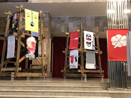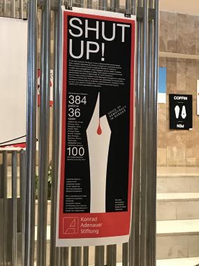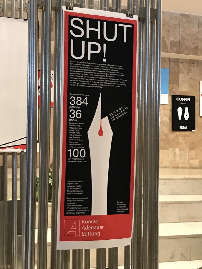 Mit den Gefahren für die Presse- und Meinungsfreiheit setzt sich die von dem ukrainischen Graphikdesigner Mykola Kowalenko konzipierte Plakatausstellung „Shut up! The Voice of Democracy is in Danger“ auseinander. Die Ausstellung wird derzeit mit Unterstützung der Konrad-Adenauer-Stiftung im Charkiwer Operntheater gezeigt. Mykola Kowalenko berichtete Prof. Dr. Lammert unter anderem von der großen internationalen Resonanz dieses Projekts, das Plakate aus insgesamt 36 Ländern zeigt.