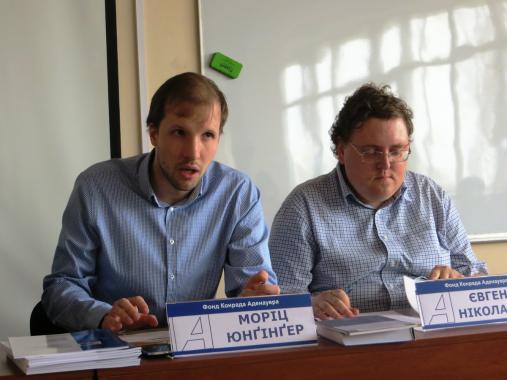 Die Präsentationwurde durch mit einem Grußwort von Moritz Junginger für das KAS-Auslandsbüro eröffnet. Er berichtete kurz über die Grundstufen der Etablierung der Sozialen Marktwirtschaft in Deutschland. Kateryna Bilotserkovets, die die Herausgabe dieser Broschüre koordiniert hatte, erzählte über die Schwerpunkte der KAS-Tätigkeit in der Ukraine.