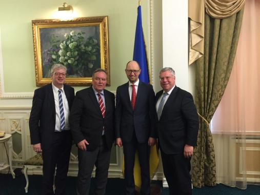 Bei seinem ersten Besuch in der Ukraine in seiner neuen Funktion als außenpolitischer Sprecher der CDU/CSU-Bundestagsfraktion führte Herr Jürgen Hardt hochrangige Gespräche mit der ukrainischen Regierung, Parlamentariern und Vertretern der Zivilgesellschaft in Kiew. Herr Hardt, Herr Rühe und Herr Falenski trafen den Ministerpräsidenten der Ukraine Arsenij Jazenjuk, die Fraktionsvorsitzende der Partei „Batkiwschtschyna“ Julia Tymoschenko, den Fraktionsvorsitzenden der Partei „Samopomitsch“ Oleg Beresjuk und den Vorsitzenden der Deutsch-Ukrainischen Parlamentariergruppe Serhij Taruta.
