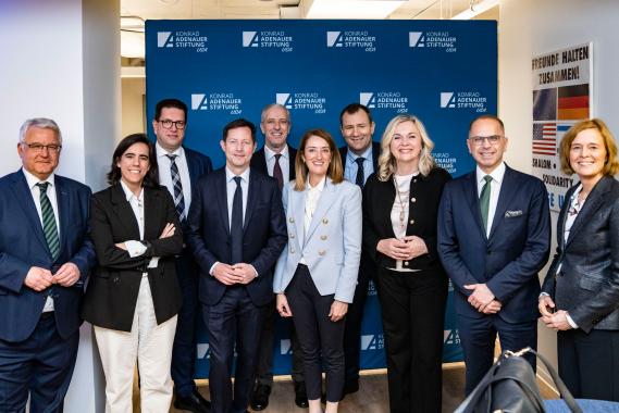 Members of the European Parliament and U.S. experts in transatlantic relations met at the KAS Office USA to discuss the future of the partnership. The parliamentarians are members of the academy of the EPP group, the delegation was let by MEP François-Xavier Bellamy. The guest of honor was Roberta Metsola, President of the European Parliament. Key topics included trade agreements, defense strategies, and the situation in Ukraine.