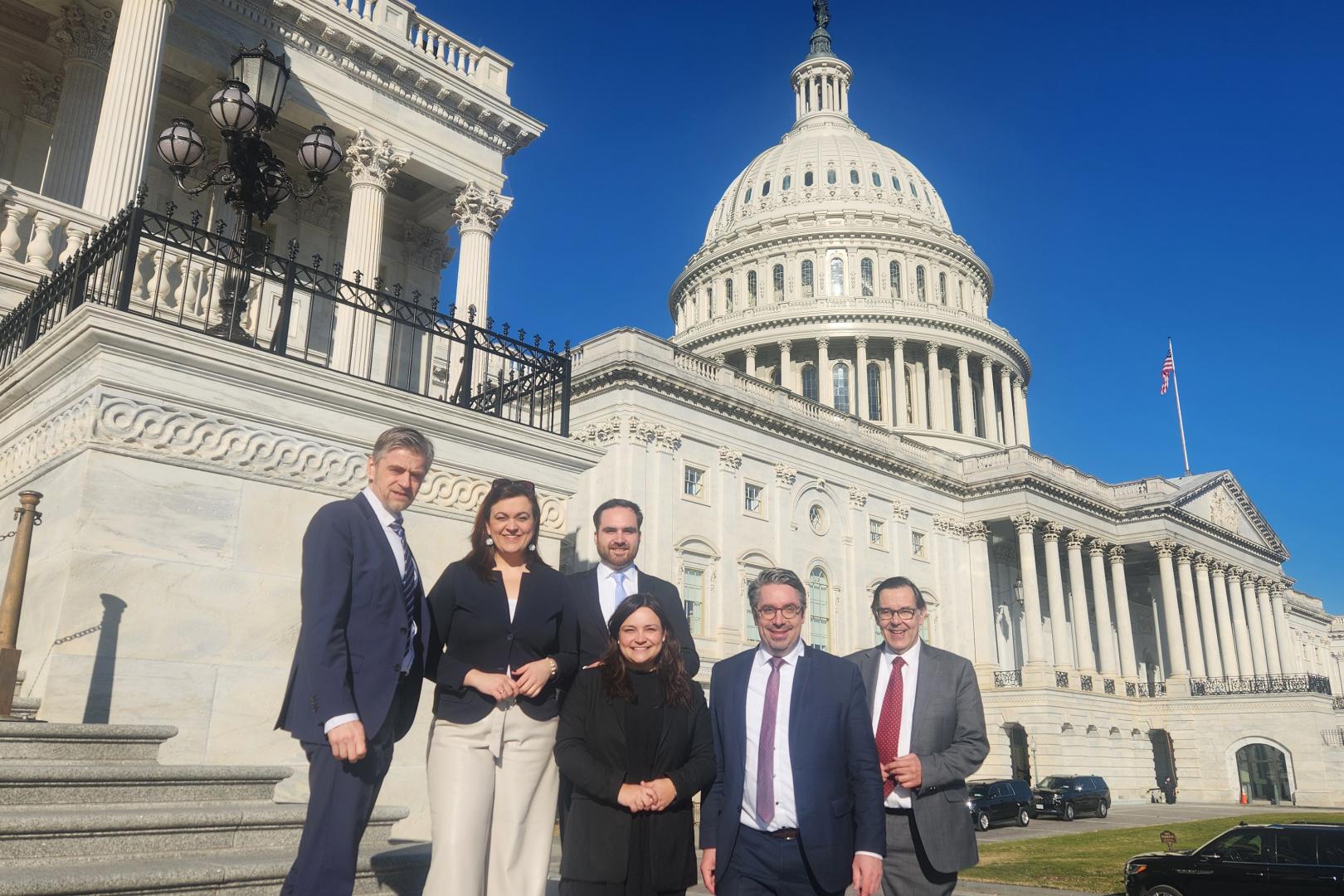 Die CDU-Abgeordneten Catarina dos Santos-Wintz, Franziska Hoppermann, Maximilian Mörseburg and Stefan Rouenhoff besuchten in Begleitung von Dr. Lars Hänsel, Leiter des Regionalteams Europa/Nordamerika der KAS, den US-Kongress und tauschten sich mit Abgeordneten der Republikaner und der Demokraten sowie mit José Cunningham, RNC National Committeeman für Washington, DC, Elliot Echols, Political Director des RNC, und Patrick Mara, Vorsitzender der Republikanischen Partei für den District of Columbia (DC GOP) über die parlamentarische Zusammenarbeit aus. Über die Lage der Republikanischen Partei und ihr Kandidatenfeld während der Primaries informierten Geoff Kabaservice, Vice-President Political Studies, Niskanen Center, Soren Dayton, ebenfalls Niskanen Center, und vom International Republican Institute (IRI) Jan Surotchak, Senior Director for Transatlantic Strategy und Antonia Ferrier, Vice President for External Affairs. Ein Arbeitsbesuch im Außenministerium thematisierte amerikanische Erwartungen an die transatlantische Zusammenarbeit mit Blick auf China und Russland. Botschafter Andreas Michaelis empfing die Delegation für ein Briefing über die innenpolitische Lage. Vom American Jewish Committee (AJC) wurden die Gäste willkommen geheißen für eine Diskussion über die Auswirkungen des Angriffs der Hamas auf Israel auf die jüdische Gemeinschaft in den USA. Zu den Gesprächspartnern gehörten neben Botschafter Peter Rosenblatt und Michael Sieveking vom AJC unter anderem Rabbi Eric Fusfield von B’nai B’rith International, Stephen Schneider vom American Israel Public Affairs Committee und Lesley Weiss von der National Coalition Supporting Eurasian Jewry. Die Transatlantische Datenpolitik stand im Mittelpunkt eines Treffens bei der Information Technology and Innovation Foundation (ITIF) mit deren Vizepräsident für globale Innovationspolitik Stephen Ezell, Nigel Cory, Associate Director Trade Policy, und Hodan Omaar, Senior Policy Analyst. Das KAS-Büro USA bot den Rahmen für einen Austausch über das Verhältnis der USA, Kanadas und Mexikos in Migrations- und Handelspolitik. Dazu trafen sich die Delegationsmitglieder mit Christopher Hernandez-Roy vom Center for Strategic and International Studies (CSIS), Jeff Rathke, Präsident des American German Institute (AGI) und Doris Meissner vom Migration Policy Institute.