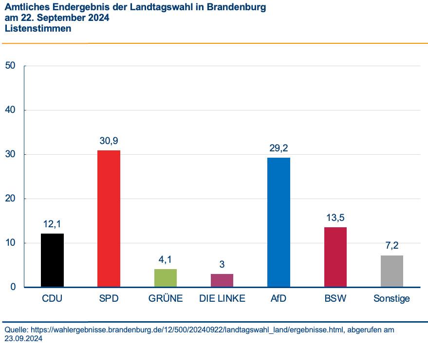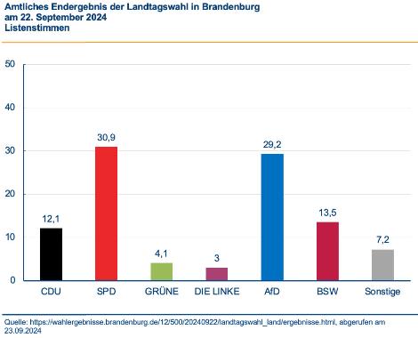 In the end, the SPD is just ahead of the AfD, followed at a considerable distance by the BSW and CDU. All other parties failed to make it over the five percent hurdle. The direct mandates went exclusively to the SPD and AfD. This means that the Brandenburg state parliament now only consists of four parties.