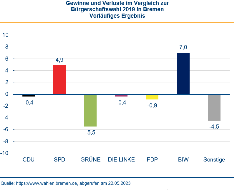 The elections to the Bremen Parliament are special. Elections are held in two separate electoral areas, Bremen and Bremerhaven, in each of which the AfD was not admitted in this election due to invalid voting documents. The existing five-vote electoral law leads to a more elaborate counting process that takes significantly longer than in other state elections. This analysis is an updated version and discusses the preliminary result based on a full count of all votes.