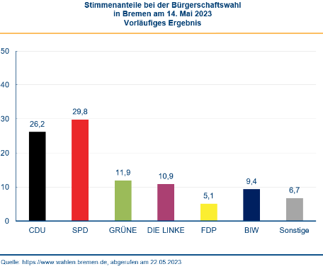 The CDU almost repeats its good election result from 2019 with 26.2 per cent, but could not benefit even more from the dissatisfaction with the Senate. The Greens have to accept losses and come in at 11.9 per cent. Their policies and their top candidate Maike Schaefer are polarising. The Left Party, traditionally strong in Bremen, confirms its electoral success of 2019 with 10.9 per cent. It benefits from the reputation of its top candidate Kristina Vogt.