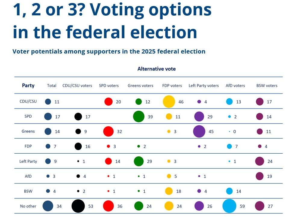 Voter potentials provide insight into what is possible for parties – in particular, which constituencies contain voters who would also consider voting for other parties. Our chart of the month shows voter potentials in the 2025 federal election.