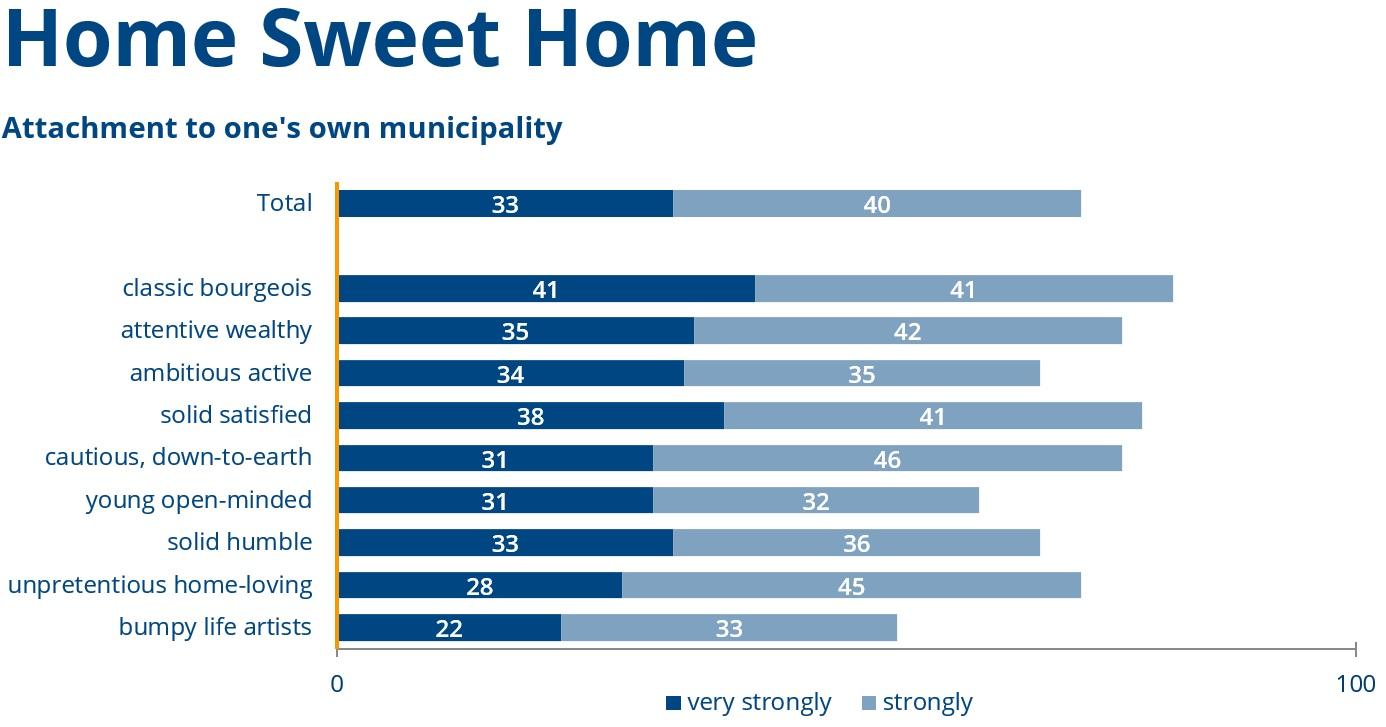 The lifestyle groups differ to some degree. The classic bourgeois, a well-off group with a reluctance to change, feel a particularly strong attachment to their own region. On the other hand, the bumpy life artists, who have limited financial resources and are very open to change, have the least attachment to their own neighbourhood.
