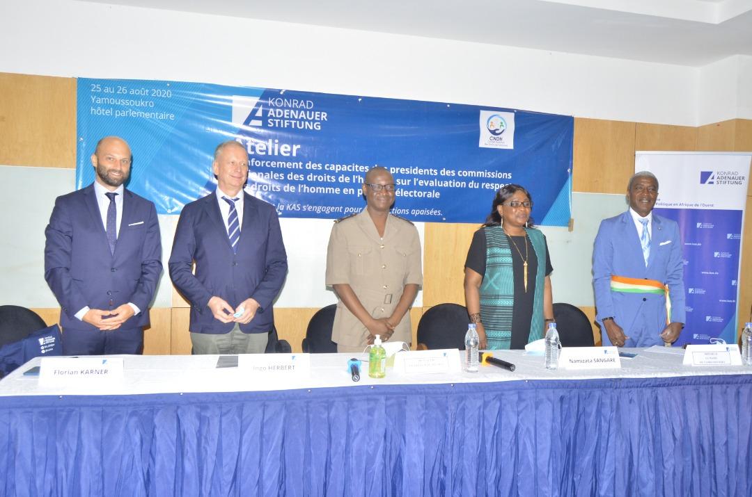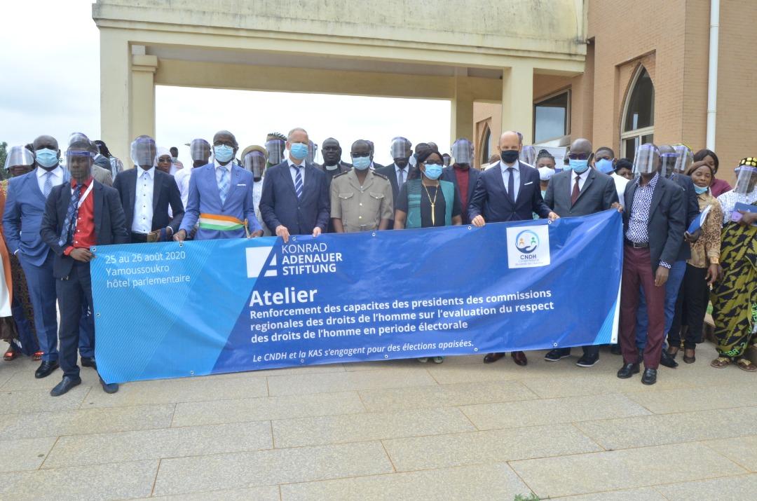 Held from the 24th to 29th August 2020 in Yamoussoukro, the opening ceremony was marked by the participation of the Ambassador of the Federal Republic of Germany to Côte d'Ivoire and a number of local authorities, notably the Regional Prefect and the Mayor of Yamoussoukro. In his opening speech, Mr. Florian Karner, Resident Representative of KAS, emphasised that due to its credibility among the population and its neutrality towards political actors, the CNDH is an actor of hope for the people. Thereafter, His Excellency the Ambassador of the Federal Republic of Germany to Côte d'Ivoire, Mr. Ingo Herbert, expressed Germany's willingness to stand by Côte d'Ivoire in its efforts to promote a peaceful and transparent electoral process. Finally, the representative of the Regional Prefect, Mr. Yaya Coulibaly, Secretary General of the Prefecture of Yamoussoukro, welcomed the initiative and urged all stakeholders to work impartially, neutrally and professionally to ensure that the upcoming elections respect human rights in order to consolidate the country's democratic gains.