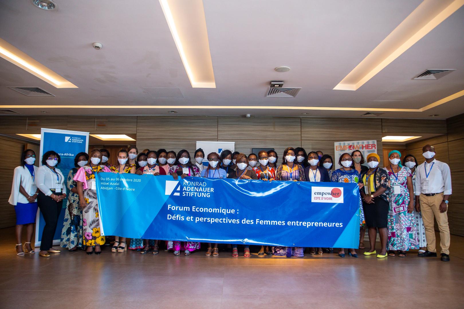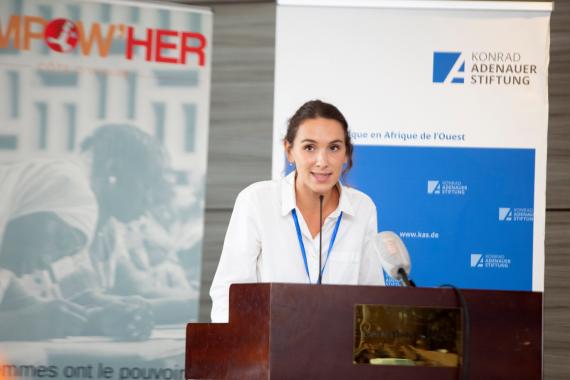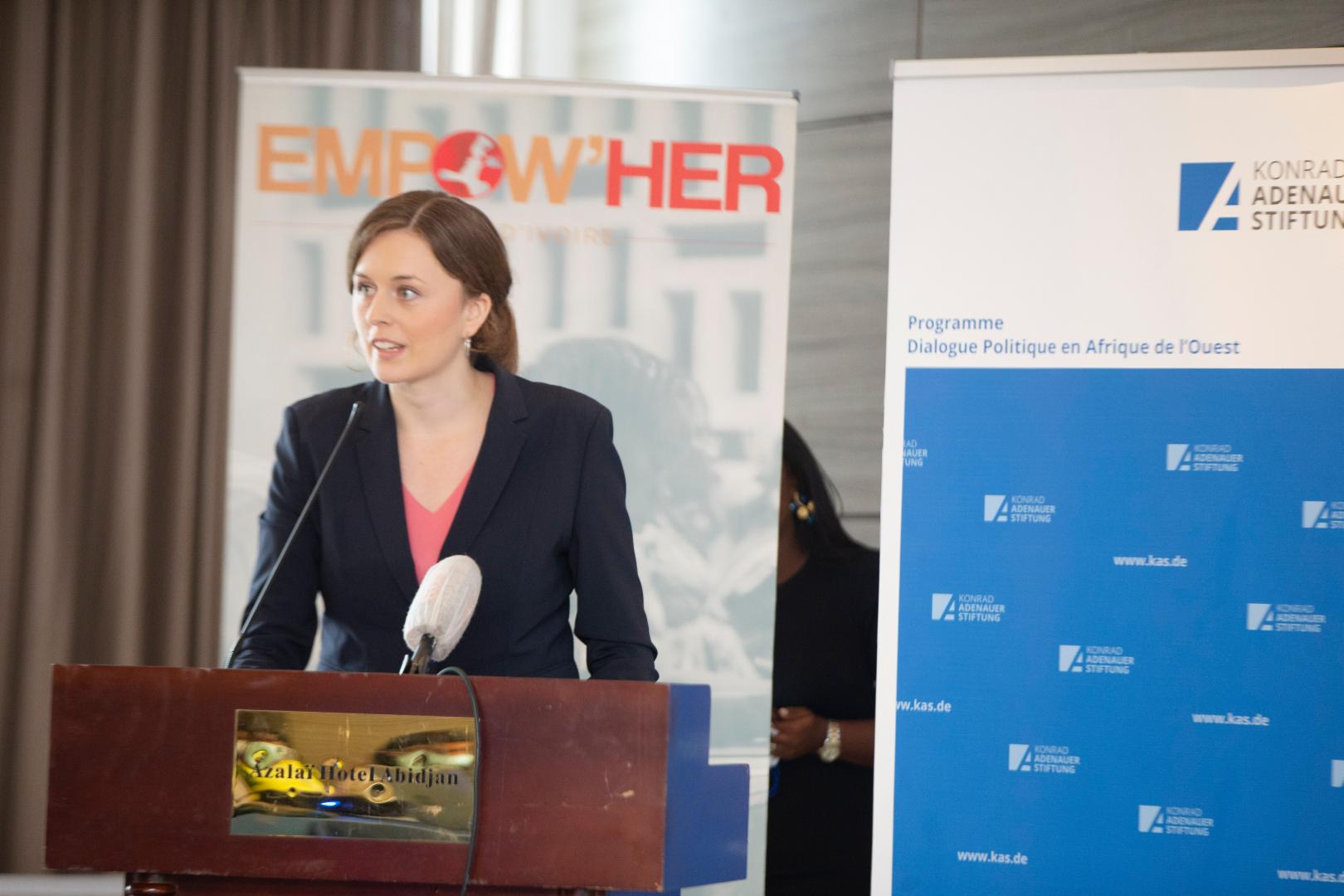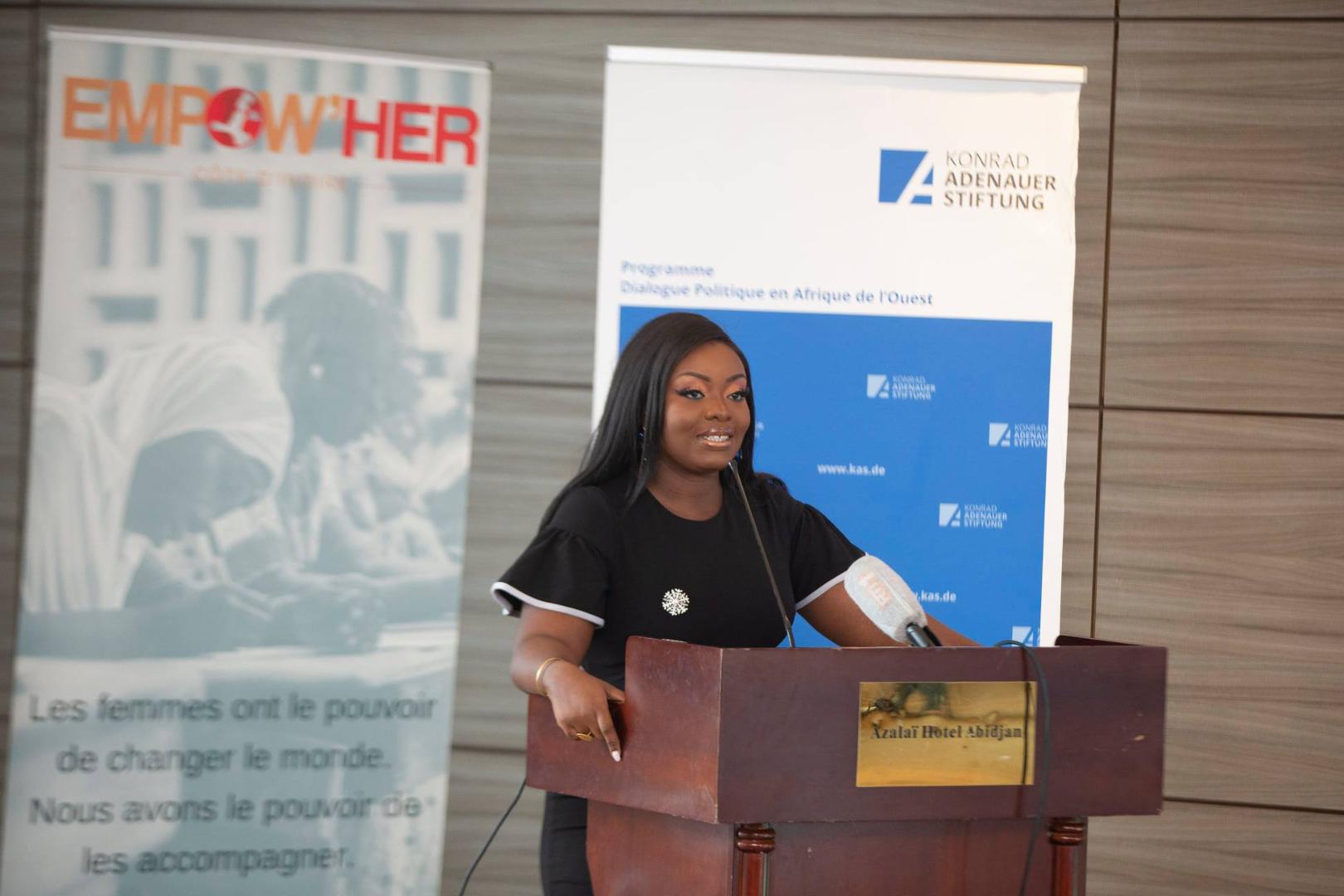 La première journée du forum a été ouverte par la modératrice Mme Paule Aurore KOFFI, et a débuté par les allocutions de bienvenue de Mme Katharina HOPP, Représentante résidente adjointe de la KAS et Mme Chloé RONCAJOLO, Directrice Empow’her Côte d’Ivoire. Ces allocutions ont porté sur l’importance de la contribution des femmes dans l’économie nationale de la Côte d’Ivoire et de la nécessité de les accompagner dans leurs entreprises afin qu’elles puissent faire face aux différents challenges.