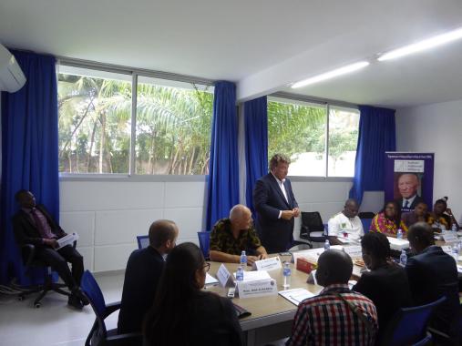 Den Auftakt bildete ein Gespräch mit dem deutschen Botschafter in Abidjan, der über die politische und die sozio-ökonomische Situation im Land berichtete. In seinem Grußwort im Rahmen den Feierlichkeiten zum Tag der Deutschen Einheit am 3. Oktober zog Herr Stritzl eine Parallele zwischen der Wiedervereinigung Deutschlands und den Bemühungen der Côte d’Ivoire, die einstige Spaltung des Landes während des Bürgerkrieges zu überwinden. Beide Länder hätten in dieser Hinsicht großes geleistet, dennoch bleibe die Herausforderung bestehen, die Einheit auch in den Köpfen der Menschen zu vollenden.