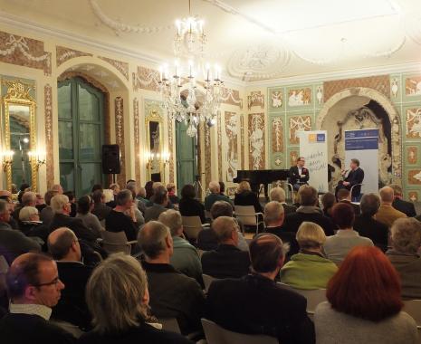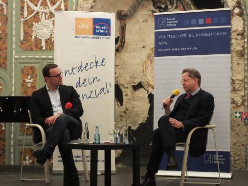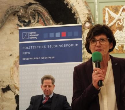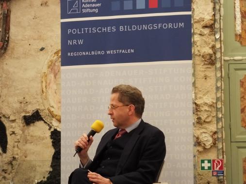 Dr. Hans-Georg Maaßen gab den anwesenden Gästen einen Einblick in die Arbeit seiner Behörde, die sich sonst der öffentlichen Aufmerksamkeit entzieht. So hätte die investigative Arbeit seiner Mitarbeiter in jüngster Zeit viele gewaltbereite Islamisten rechtzeitig "aus dem Verkehr ziehen können". Die Arbeit des Inlandsgeheimdienstes sei jedoch auf eine gute Kommunikation unter den Sicherheitsbehörden angewiesen. Das gemeinsame Terrorabwehrzentrum in Berlin gebe die nötigen Rahmenbedingungen für eine Verständigung und einen Austausch über potentielle Gefährder. Auch die 16 Landesämter für Verfassungsschutz müssten bedenken, dass die im jeweiligen Bundesland agierenden Islamisten auch über die Landesgrenzen hinaus eine Gefahr darstellen. Als Beispiel verwiesen Spahn und Maaßen auf die grausamen bundesweiten Attentate des NSU. Eine in den Medien spekulierte Zentralisierung des Verfassungsschutzes laufe Gefahr, regionale Entwicklungen zu übersehen.