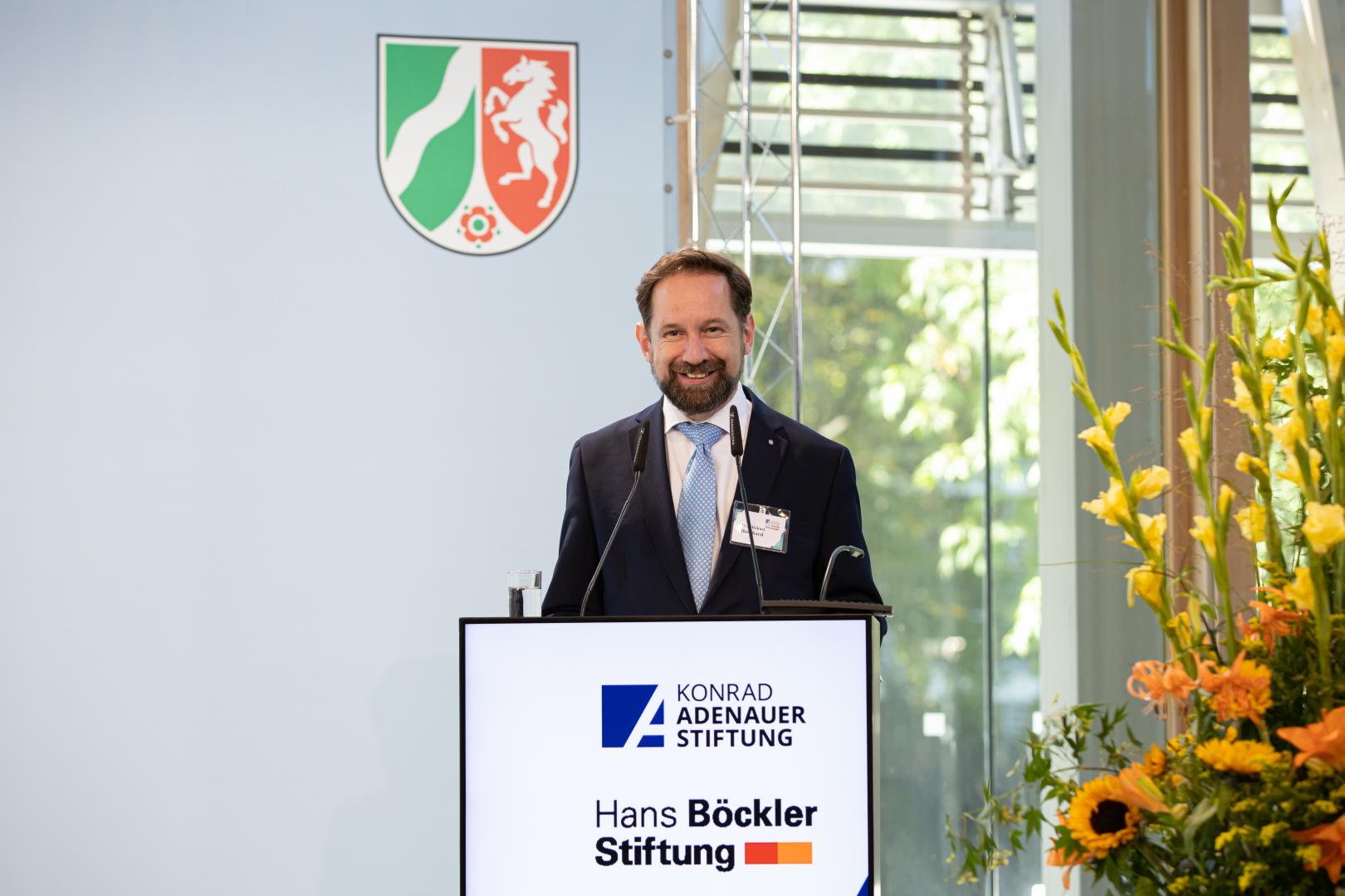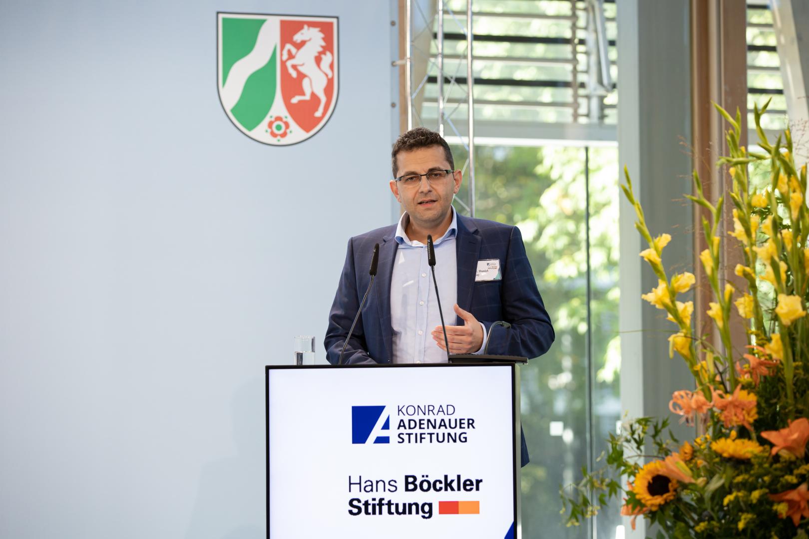 In der Podiumsdiskussion sprachen Reiner Hoffmann, Carsten Linnemann und Dennis Radtke über die Herausforderungen und Chancen der Mitbestimmung im digitalen Zeitalter. Der Vorsitzende des Deutschen Gewerkschaftsbundes und der Hans-Böckler-Stiftung Reiner Hoffmann betonte, dass sich der Wert der Mitbestimmung im Rahmen der Corona-Pandemie deutlich gezeigt habe. Die Kooperation zwischen Arbeitnehmerinnen und Arbeitnehmern und Arbeitgeberinnen und Arbeitgebern habe aber insbesondere da gut funktioniert, wo bereits ausreichende Regelungen vorhanden waren. Er forderte in diesem Zusammenhang insbesondere ein digitales Zugangsrecht der Betriebsräte zu den Betrieben, um Sozialpartnerschaft auf Augenhöhe zu ermöglichen. Carsten Linnemann, Bundesvorsitzender der Mittelstands- und Wirtschaftsunion der Union, entgegnete, die Wirtschaft brauche angesichts der fortschreitenden Globalisierung mehr Flexibilität. Man müsse anstatt eine Schablone anzulegen flexible Lösungen, wie beispielsweise eine Wochenarbeitszeit, ermöglichen, um auf die Bedarfe der Unternehmen und Mitarbeitenden zu reagieren. Der Vorsitzende der CDA Nordrhein-Westfalens und Mitglied des Europäischen Parlaments Dennis Radke hob mit Blick auf die letzten vier Jahre die Erfolge des Betriebsrätemodernisierungsgesetzes hervor, das einen wichtigen Beitrag geleistet habe. Er sehe in der abnehmenden Tarifbindung und betrieblichen Vertretung die zentralen Gefahren für die Mitbestimmung und setze sich zudem dafür ein, Vermeidungsstrategien, wie beispielsweise das SE-Gesellschaftsrecht, zu verhindern.