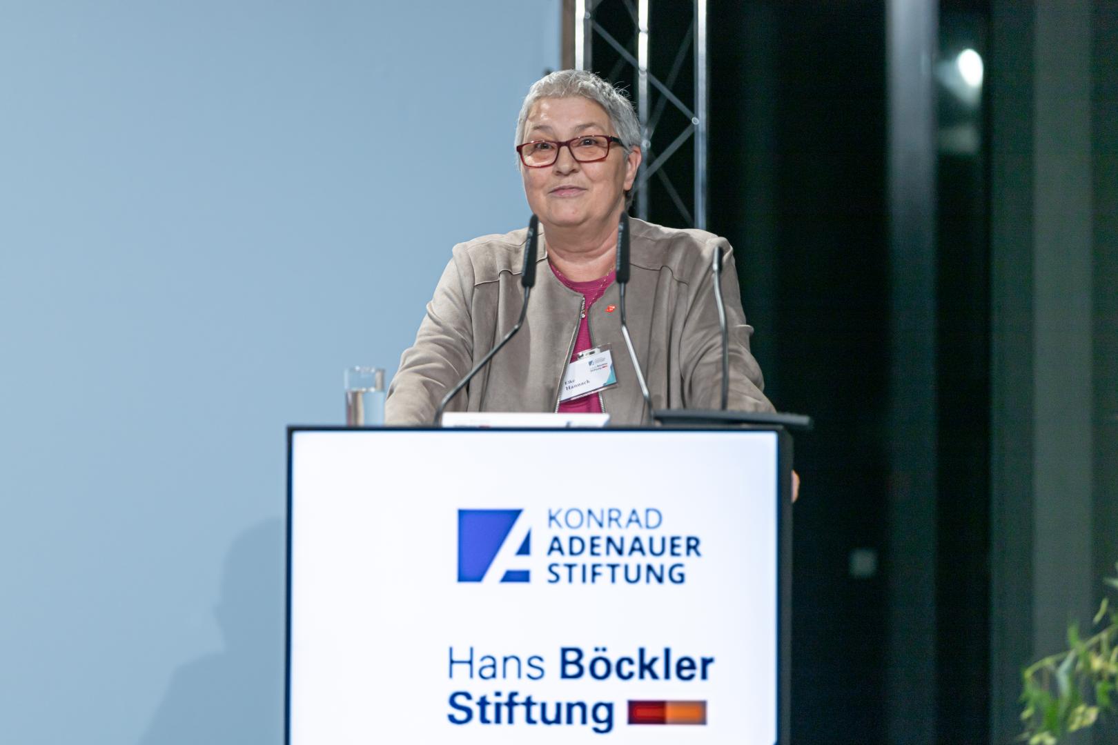 Birgit Steinborn, Vorsitzende des Gesamtbetriebsrats und stellvertretende Vorsitzende des Aufsichtsrats der Siemens AG, bedankte sich für den Einwand von Frau Göbel und nutze ihr Statement, um Gegenthesen zu entwerfen. Mitbestimmung sei ein Treiber von Fortschritt und Innovation. Um Zeitverzögerung zu verhindern, sei es essenziell, Mitbestimmungsprozesse früh in dem Entscheidungsprozess einzubinden. So würde Mitbestimmung schneller und besser. Mitbestimmung sei dabei keine Formalie, sondern eine Kultur. Als Beispiel nannte sie die Aufspaltungen und Ausgliederungen der Siemens AG in den letzten Jahren sowie das dreiseitige Abkommen von Radolfzell, in dem betriebsbedingte Kündigungen und Standortschließungen ausgeschlossen sind. Durch Mitbestimmung sei es gelungen, Beschäftigungsbedingungen und Tarifverträge abzusichern und den Beschäftigten Halt zu geben.