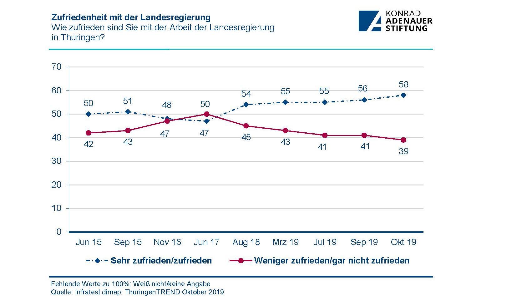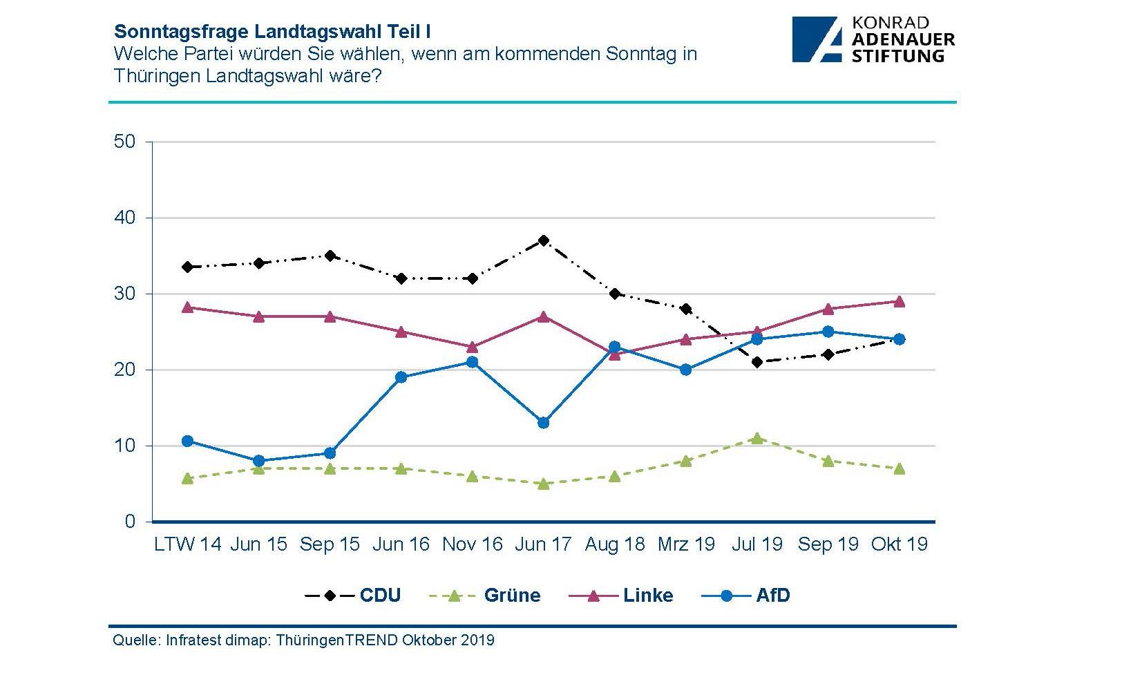 Schwierige Mehrheitsverhältnisse, wie sie sich in Thüringen abzeichnen, sind hingegen kein Novum. Sie bestanden in Sachsen-Anhalt (zwei Legislaturperioden seit 1994), in Nordrhein-Westfalen und in Hessen. Aufgrund der unterschiedlich gestalteten Landesverfassungen ergaben sich verschiedene politische Lösungen. In Thüringen kommt hinzu, dass eine Mehrheitsbildung ohne die Linke oder die AfD nicht möglich ist. Aus den Umfragedaten gibt es keine klare Präferenz für irgendein Koalitionsmodell. Eine Beteiligung an der Landesregierung von CDU, Linker und SPD findet jeweils etwa die Hälfte der Thüringer gut (Forschungsgruppe Wahlen). Auch alle anderen Meinungsdaten lassen keine klaren Präferenzen erkennen: Die Thüringer sind für alles offen, solange die AfD nicht beteiligt wird. Nur ein Drittel findet es richtig, dass die CDU eine Koalition von CDU und Linker ausgeschlossen hat (Forschungsgruppe Wahlen). In der CDU-Anhängerschaft sind 68 Prozent der Ansicht, dass über eine Koalition mit der Linkspartei neu entschieden werden solle. Dies sehen im Fall der AfD 17 Prozent der CDU-Anhänger so (Infratest dimap).