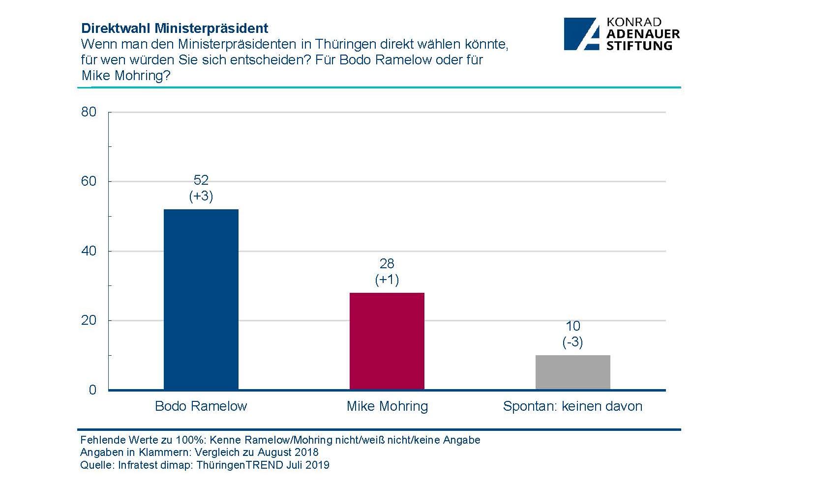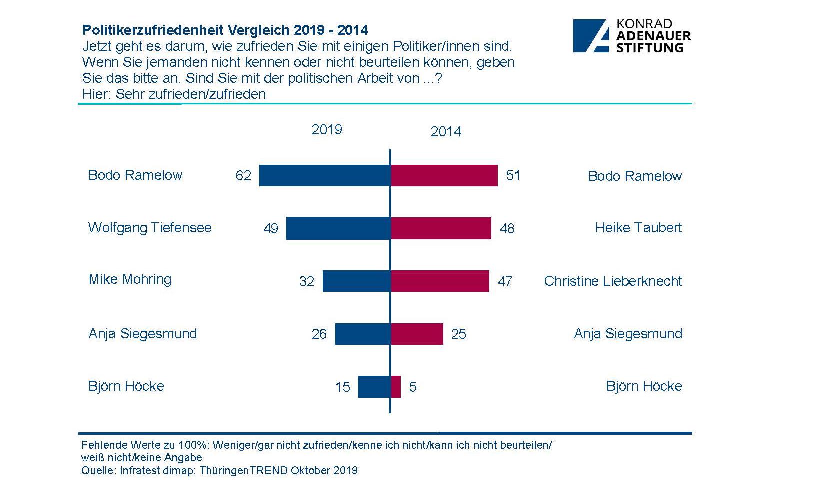Die Linke kann in Thüringen vom Amtsbonus des Ministerpräsidenten Bodo Ramelow profitieren. 53 Prozent hätten ihn und 32 Prozent Mike Mohring als Ministerpräsidenten gewünscht. Im Vergleich zu anderen Wahlen ist dies im Fall von Ramelow kein überragender Wert, im Fall von Mohring ein recht guter. Bei der individuellen Bewertung der Leistung des Ministerpräsidenten schneidet Ramelow hingegen sehr gut ab. 73 Prozent der Thüringer sagen, er würde seine Sache gut machen. Selten werden hier bessere Werte erreicht. So konnte z.B. Annegret Kramp-Karrenbauer im Saarland mit 80 Prozent, Michael Kretschmer in Sachsen mit 77 Prozent und Winfried Kretschmann in Baden-Württemberg mit 84 Prozent bessere Werte verbuchen. Ramelow ist es gelungen, sich von seiner Partei abzusetzen. Auf einer Skala von +5 bis -5 erhält er einen Wert von 1,6, die Linke im Land erreicht 1,1 und die Linke im Bund wird von den Thüringern mit 0,3 deutlich schwächer bewertet. In der eigenen Anhängerschaft erhält er mit 4,0 einen ausgesprochen hohen Wert. Mohring kommt bei allen Anhängern auf 0,9, in der eigenen Anhängerschaft auf sehr gute 3,0. Die CDU wird mit 0,9 so eingestuft wie der Kandidat, ihre Leistung in der Opposition mit 0,6 hingegen schlechter. Dass die Bewertung der Spitzenkandidaten lediglich bei Ramelow eine positive Wirkung auf das Wahlergebnis entfaltet hat, zeigt sich bei Wolfgang Tiefensee. Bei allen Thüringern wird er mit 1,3 bewertet, die eigenen Anhänger geben ihm den Wert von 3,0, während die SPD auf 0,6 (sowohl als Partei als auch in der Regierung) kommt. Doch trotz der positiven Bewertung des Spitzenkandidaten, konnte der die SPD nicht vor weiteren Verlusten bewahren. Björn Höcke polarisiert wie alle Kandidaten der AfD. Er kommt bei allen Thüringern auf einen Wert von -2,6, in der eigenen Anhängerschaft hingegen auf +2,3. Die mediale Diskussion um den Rechtsextremismusgehalt seiner Aussagen hat ihm in der eigenen Anhängerschaft offenbar nicht geschadet. Er schneidet sogar besser ab als die beiden letzten dem „Flügel“ angehörigen Kandidaten der AfD in Sachsen und Brandenburg. Diese wurden mit 1,9 (Urban) und 1,5 (Kalbitz) in der AfD-Anhängerschaft schwächer bewertet (Forschungsgruppe Wahlen).