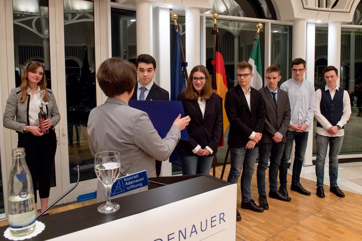 Der 1. Preis überreichte Dr. Ulrike Hospes, Leiterin des Büros Bundesstadt Bonn, an das Stadtgymnasium Köln-Porz für eine Schülerzeitung über Konrad Adenauer. Die filmische Inszenierung "Vergabe des Pius-Preises an Konrad Adenauer", angelehnt an den Karlspreis, durch das Bischöfliche Pius-Gymnasium in Aachen erreichte den 2. Platz. Mit der Erstellung einer Website zu Konrad Adenauer belegte das Wilhelm-Dörpfeld-Gymnasium aus Wuppertal den 3. Platz.