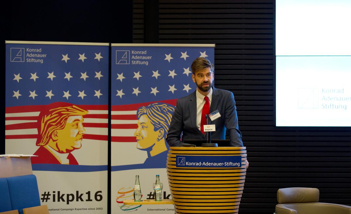 Scott Goodstein, CEO von Revolution Messaging, erläuterte im Workshop vor der eigentlichen Konferenz, wie eine erfolgreiche Wählerbindung im Wahlkampf gelingen kann. Der Firmenchef leitete 2008 als externer Online Direktor die Kampagne „Obama for America“ und begleitete zuletzt die Bernie-Sanders-Kampagne. Der Schlüssel für einen gelingenden Wahlkampf sei die Persönlichkeit des Kandidaten in den Fokus zu rücken. „Die Wähler sollen sich fühlen als seien sie Teil der Kampagne“, so Goodstein. Sanders Authentizität und Glaubwürdigkeit waren der Erfolgsgarant ihrer Kampagne. „Die Menschen wollen keine Strategie-Papiere auf der Kandidaten-homepage lesen, sondern die Person sehen“, erklärte Goodstein. So wurde die Onlineseite von Bernie Sanders so gestaltet, dass auf der Startseite statt einer umfangreichen Navigationsstruktur und einzelnen Textbausteinen, nur ein großes Foto von Bernie Sanders zu sehen war mit einem Link zum Newsletter und einer weiteren, dezenten Verlinkung hin zu den Wahlkampfspenden. Die Authentizität und Geradlinigkeit, die Sanders habe, sei bei Trump nicht zu erkennen. Er stütze sich auf einen wachsenden Populismus in den USA. Doch Goodstein geht davon aus, dass die Beliebtheit ab einem bestimmten Punkt in eine Art Peinlichkeit umschlagen werde. Mittlerweile würden einige Republikaner bereits Trump den Rücken kehren, so Goodstein.