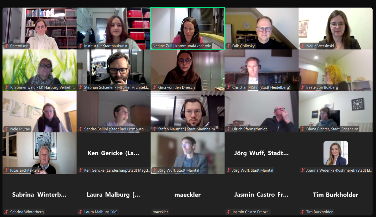 Die Teilnehmerinnen und Teilnehmer dieser digitalen Runde hatten sich aus den unterschiedlichsten Städten und Gemeinden des Bundesgebiets dazugeschaltet, und es zeigte sich ein fachlich spannender Querschnitt aus kommunalpolitisch Engagierten – Stadträte und Mitarbeitende von Kommunalverwaltungen auf Landesebene, in Landkreisen oder in Städten. Die Netzwerkteilnehmer einten die Themen Städtebau, Stadtentwicklung, Stadtplanung, Bauleitplanung oder Stadtgestaltung, Mobilität und Verkehrswesen; einige forschen und lehren an Hochschulen, Instituten oder beschäftigen sich auf Verbandsebene mit diesen oder verwandten Themen.