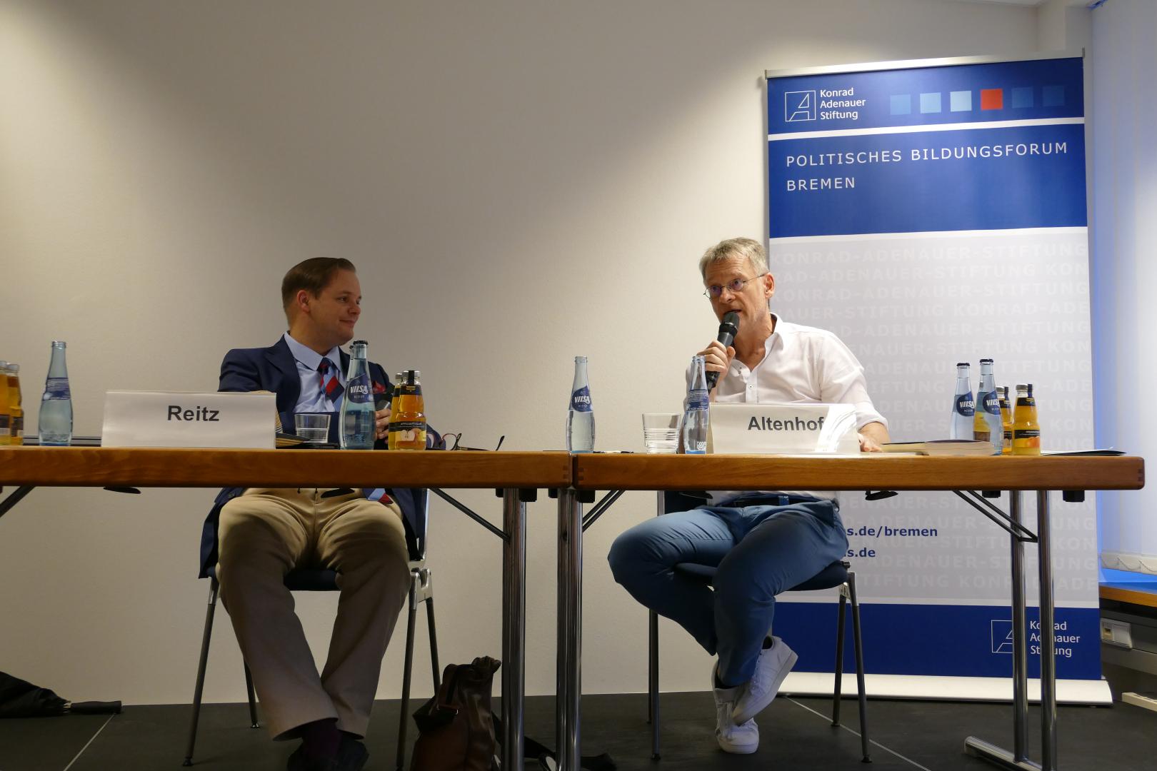 Der Leiter der KAS-Bremen, Ralf Altenhof, bedankte sich bei dem Publikum für das zahlreiche Erscheinen und führte in die Veranstaltung ein. Normalerweise würde er den Referenten ausführlich vorstellen, erklärte Altenhof, dies sei heute allerdings nicht nötig, da dessen Biografie Gegenstand des Vortrages sei. Er betonte zudem, dass man sich von allen Formen des Extremismus abgrenzen sollte, sich aber dennoch mit der Frage beschäftigen müsste, weshalb jemand vom „Pfad der Demokratie“ abweiche. Was macht die Szene attraktiv? Warum und wie ist Reitz eingestiegen? Und wie gelang ihm der Ausstieg?