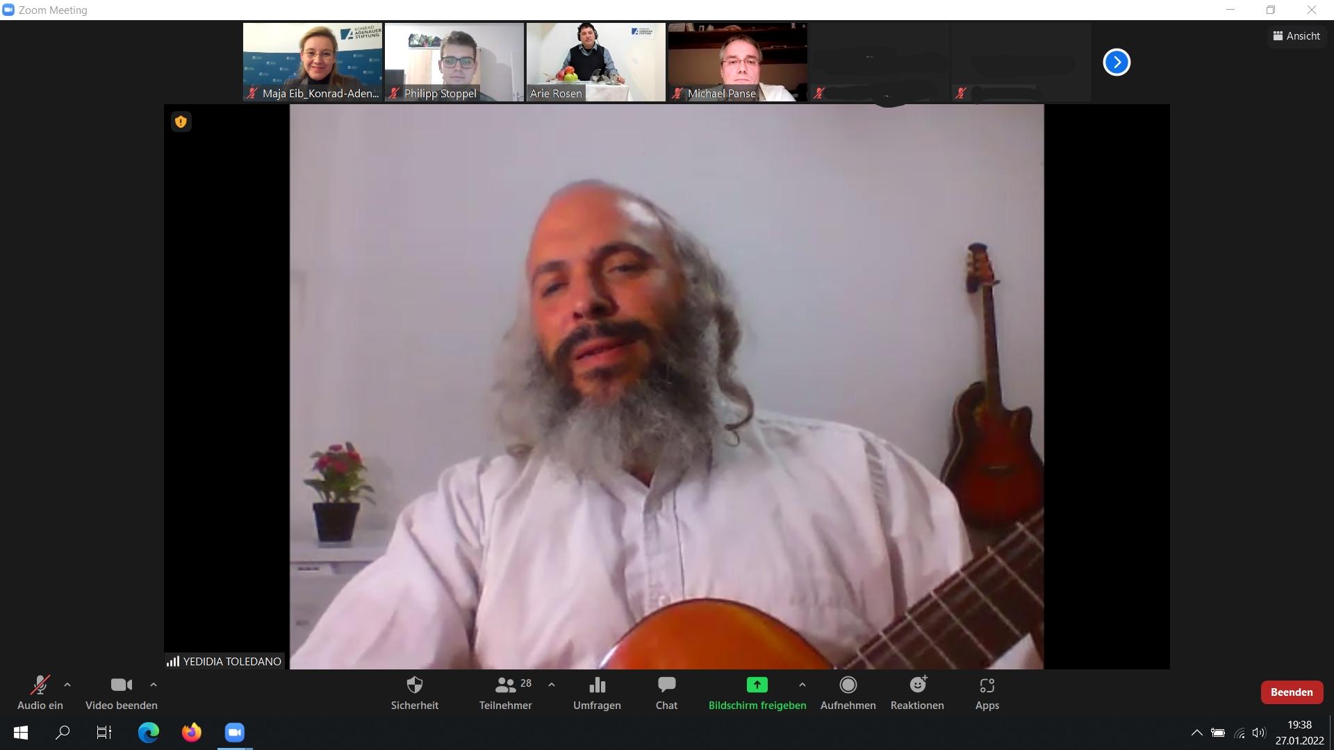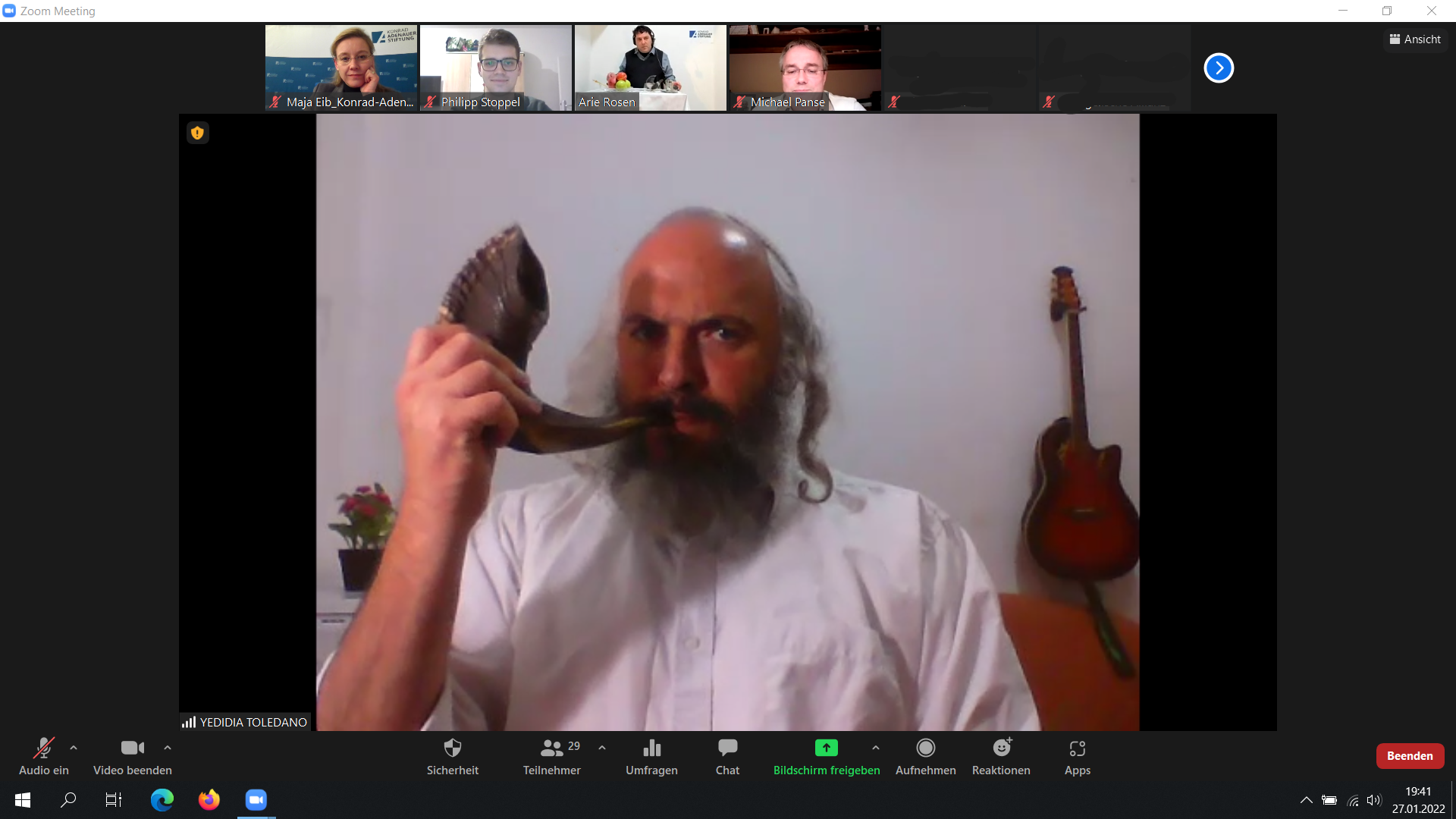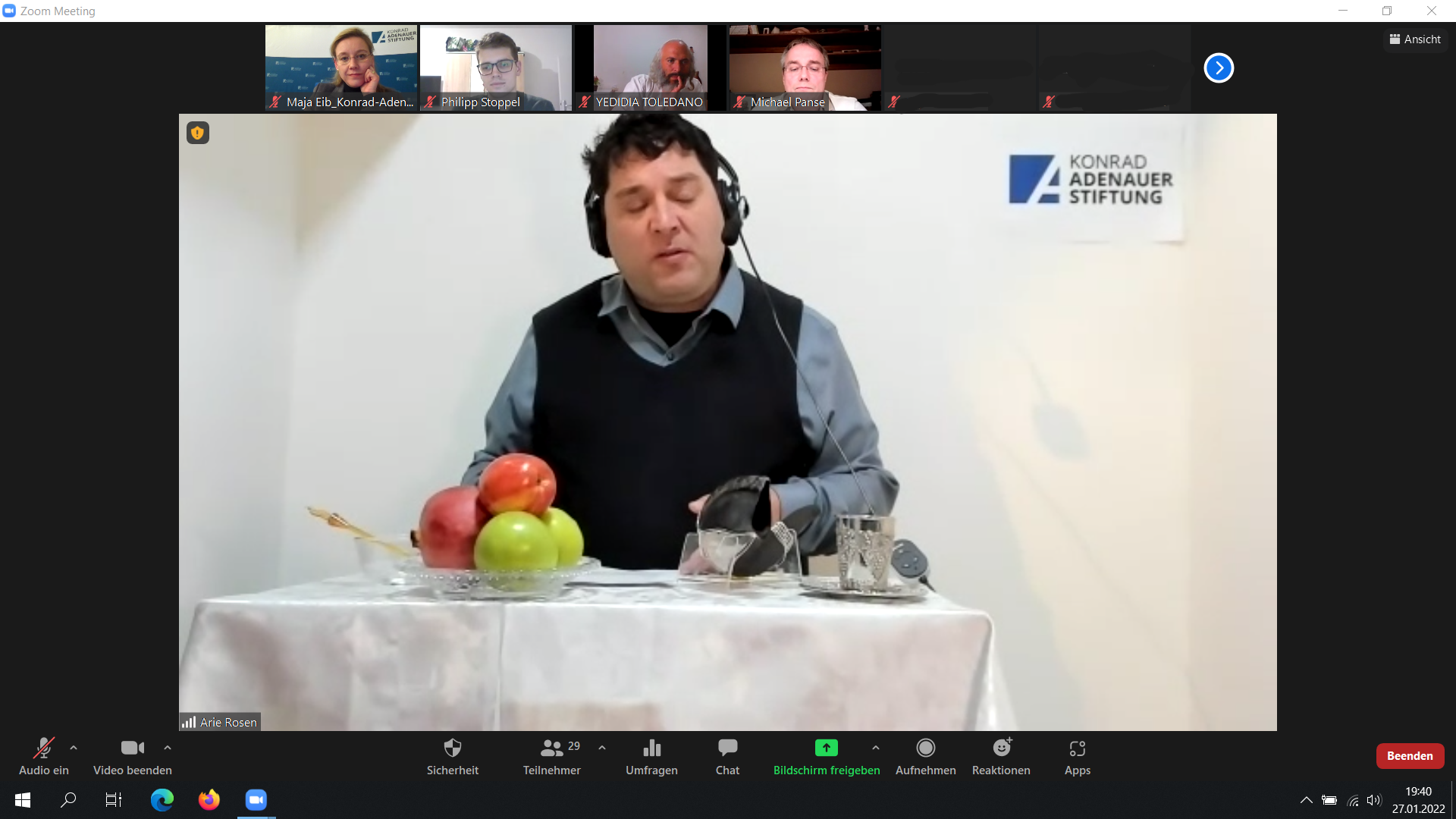 Der 27. Januar ist der offizielle Gedenktag für die Opfer des Nationalsozialismus. Ein Tag, der zum Nachdenken anregen möchte. Die Konrad-Adenauer-Stiftung nimmt diesen Tag deshalb zum Anlass, um ein Online-Seminar zu veranstalten. Das Programm „Judentum verstehen – Die hohen Feiertage“ vom Verein Kulturelle Begegnungen aus Jerusalem eröffnet die Möglichkeit, sich mit dem Judentum und den Traditionen jüdischer Familien vertraut zu machen. Das jüdische Jahr beginnt im September mit den Feiertagen Rosch Haschana und Jom Kippur. Beide Tage werden auch Gerichtstage genannt, an denen die jüdischen Gläubigen Rechenschaft gegenüber Gott und ihren Mitmenschen ablegen. Welche Bedeutung haben diese Tage für die Gläubigen und wie werden sie in der Familie und in der Synagoge begangen und gestaltet? Diesen Fragen widmete sich der Vortragsabend, der musikalische umrahmt wurde.