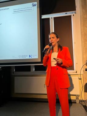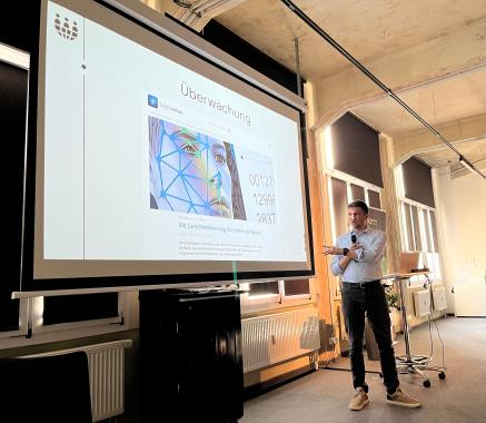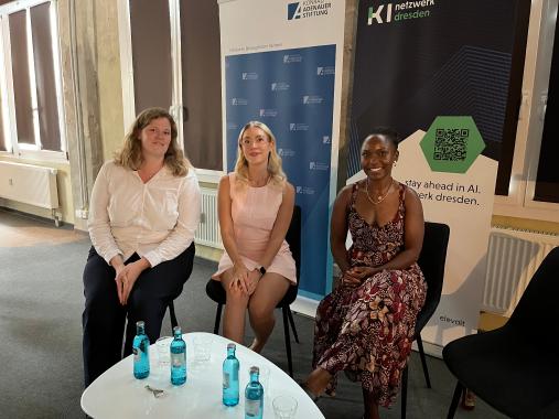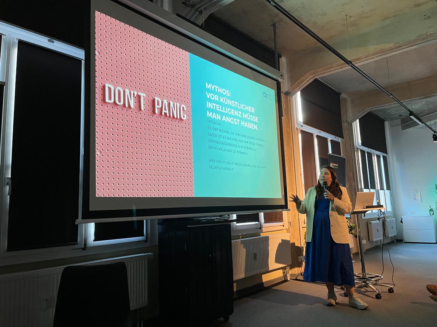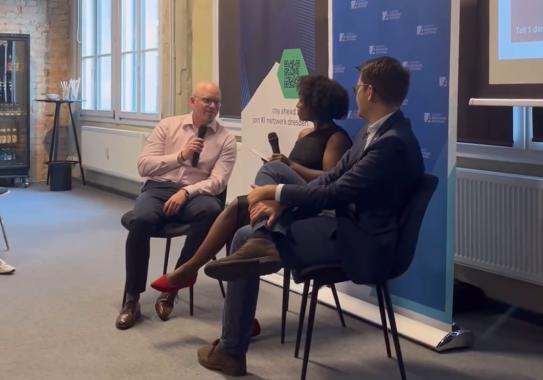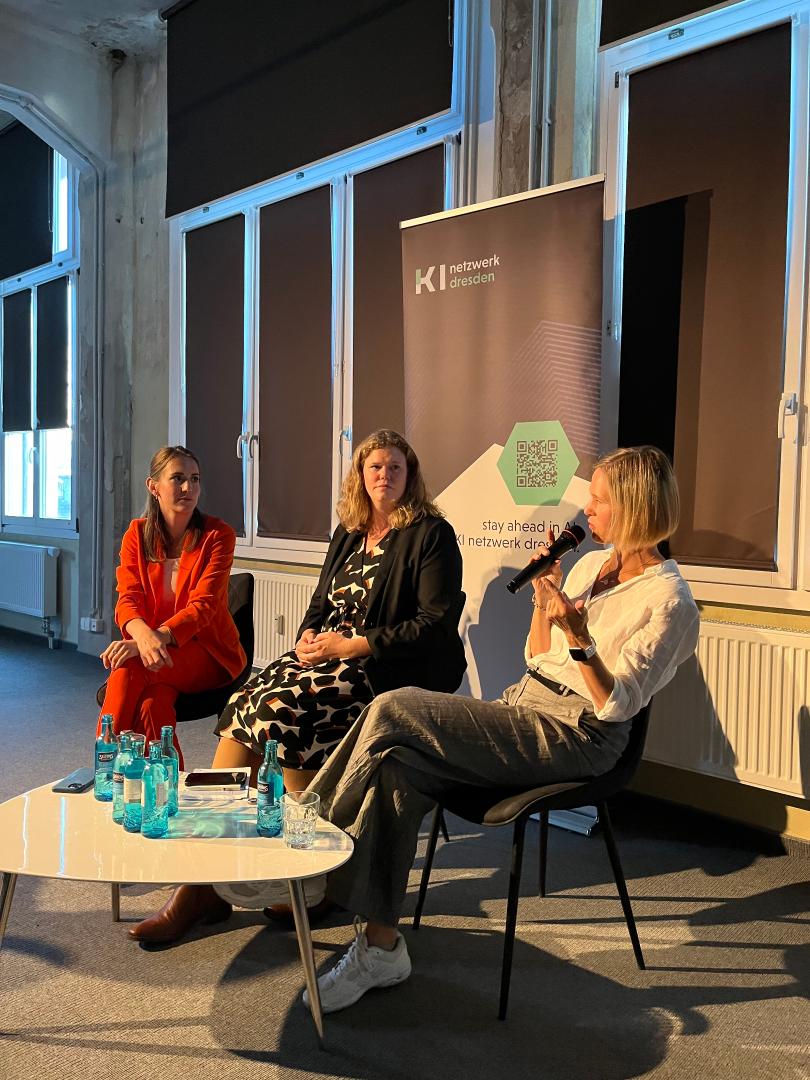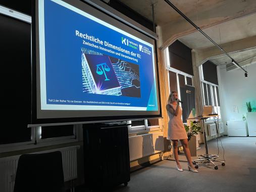 Beim zweiten Termin lag der Fokus auf der rechtlichen Dimension von KI. Die drei eingeladenen Experten betrachteten die Thematik dabei von verschiedenen Perspektiven. Erik Tuchtfeld, Wissenschaftlicher Mitarbeiter am Max-Planck-Institut für Ausländisches Öffentliches Recht und Völkerrecht, widmete seinen Vortrag der Betrachtung möglicher Gefahrenquellen durch KI. Seiner Meinung nach ergeben sich durch KI drei große Risiken: Überwachung, Täuschung und Diskriminierung. Dilemmata verhindern hier jedoch schnelle und einfache Lösungen der Probleme. Der zweite Redner des Abends, Peter Hense, Rechtsanwalt und Partner bei Spirit Legal, erzählte anhand eigener Erfahrungen über die Diskrepanz zwischen Erwartung und Realität beim Umgang mit KI und wie Benutzer KI für ihre Zwecke manipulieren können. Für ihn spielen Juristen eine zentrale Rolle bei der Entwicklung von KI. Sie sorgen für die Produktsicherheit durch die Einhaltung technischer Standards und schützen damit die Bevölkerung. Lajla Fetic, Senior Trustworthy AI Expert appliedAI Institute for Europe, brachte die soziale Komponente zur Sprache. Sie machte darauf aufmerksam, dass neben technischen Merkmalen auch ethische Fragen berücksichtigt werden müssen. Neben Regulierungen durch Regierungen müssen auch die Entwickler selbst verstärkt auf Gerechtigkeit und Toleranz achten, so Fetics Appell. Erneut tauschten sich Publikum und Gäste im Anschluss im Rahmen einer Podiumsdiskussion intensiv zu rechtlichen Fragestellungen aus und diskutierten gemeinsam über mögliche Antworten.