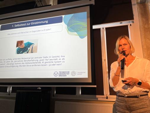 In der letzten Veranstaltung der Reihe ging es noch einmal um Menschlichkeit in der KI. Die Professorin für Religionspädagogik und Vorstandsmitglied von SCaDs.AI und Leiterin bei „Responsible AI“, Prof. Dr. Birte Platow, erzählte in ihrem Vortrag anschaulich, wie viele Menschen dazu neigen KI in ihrer Bedeutung und Macht zu überhöhen. Zuschreibung göttlicher Attribute verstärke diese Ansicht, wobei diese nicht immer begründet ist. Dr. Isabella Wiest, Leiterin der Arbeitsgruppe KI-basierte Sprachverarbeitung in der Medizin Forschungsgruppe Clinical AI, erläuterte anschließend, anhand einer fiktiven Patientin, die Möglichkeiten von KI, die bereits jetzt Anwendung in der Medizin finden. Sie zeigte auf, wie vielseitig Programme genutzt werden können und welche Vorteile die Verwendung dieser bringt, etwa die zeitliche Entlastung der Ärzte. Gleichzeitig betonte sie aber auch, sich stets zu fragen, woher die Daten stammen und nie unüberlegt anzuwenden. Neben medizinischen und ethischen wurden anschließend philosophische Fragen diskutiert.