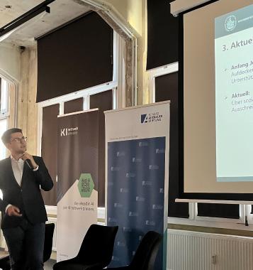 Den Auftakt der Vortragsreihe machten die beiden Experten Tammo Polle und Tim Schroeder mit einer allgemeinen Einführung zu KI. Tammo Polle, Mitarbeiter am Institut für IT-Sicherheit der Universität zu Lübeck, erklärte die Funktionsweise und Einsatzfelder von KI. Anhand von Bildern warnte er davor, wie Desinformation und Manipulation durch KI möglich sind. Tim Schroeder, seit Februar 2024 Leiter für die Abteilung für Künstliche Intelligenz im INC Innovation Center in Aachen, beschrieb im Anschluss wie man eine KI trainiert. Die Methodik der KI ähnelt dabei dem eines menschlichen Gehirns. Hierbei werden Zusammenhänge zwischen Merkmalen erkannt und daraus Prognosen entwickelt. Der Vorteil von KI liegt darin, das Finden von Mustern wesentlich effizienter und komplexer gestalten zu können. In Anbetracht der rasanten Entwicklung von KI in den letzten Jahren appellierte Tim Schroeder an das Publikum sich mit KI zu beschäftigen, diese selbst auszuprobieren und KI und dessen Ergebnisse stets kritisch zu hinterfragen. Die anschließende Podiumsdiskussion wurde von den Teilnehmenden ausgiebig genutzt, um ihre Fragen und Unsicherheiten bezüglich KI zu stellen.