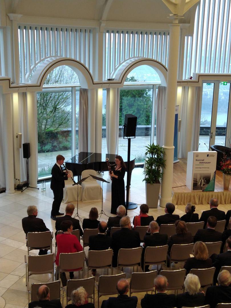 Nach dem Schlusswort von Prof. Dr. Jürgen Rüttgers erklang weit über dem Rhein – wie schon zu Beginn – eines der seltener aufgeführten Duos für Klarinette und Fagott von Beethoven, zur Aufführung gebracht von Anna Koch und Simon Kranz, zwei Stipendiaten der KAS. Mit großem Beifall für deren Leistung endete die diesjährige Feierstunde. Im nächsten Jahr freuen wir uns auf den 145. Geburtstag!