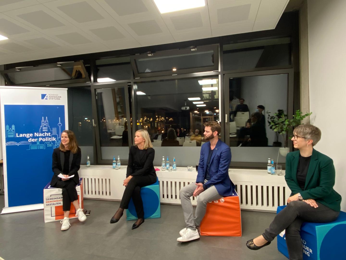 Die gesellschaftliche Sprach- und Debattenkultur stand im Mittelpunkt der Runden im Bürgerhaus Stollwerck. Ein übereinstimmendes Plädoyer für eine gepflegte Streitkultur und eine Absage an eine „cancel culture“, die gar die Wissenschafts- und Forschungsfreiheit einzuschränken versucht, eröffnete den Abend. Welche zunehmend negativen Auswirkungen im Internet zu beobachten sind, diskutierte die anschließende Runde. Hasskommentare, (fehlende) Unterstützung durch Behörden und der Wunsch nach mehr Aufklärungsarbeit an Schulen wurden anhand von praktischen Beispielen besprochen. In der dritten Diskussion des Abends wurden Ursachen für Extremismus und Auswege aus der Szene zwischen einem Politikwissenschaftler und einem Aussteiger diskutiert.