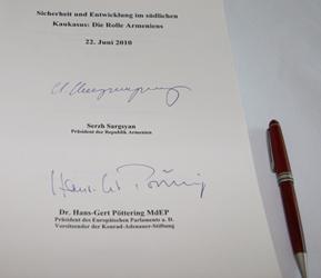 Der Vorsitzende der Konrad-Adenauer-Stiftung, Dr. Hans-Gert Pöttering, hatte zuvor in seiner Begrüßung auf die Bedeutung stabiler Verhältnisse im Südkaukasus für Europa hingewiesen. „Es liegt im eigenen Interesse der EU, dass hier Sicherheit und Stabilität herrschen.“ Anhaltende Konflikte wie im Gebiet um Bergkarabach, Abchasien oder Südossetien bedürfen schneller und nachhaltiger Lösungen. Dabei seien ausbleibende Erfolge bei Friedensbemühungen zwar zu bedauern, „diese dürfen aber nicht zu Resignation führen“, so Pöttering.