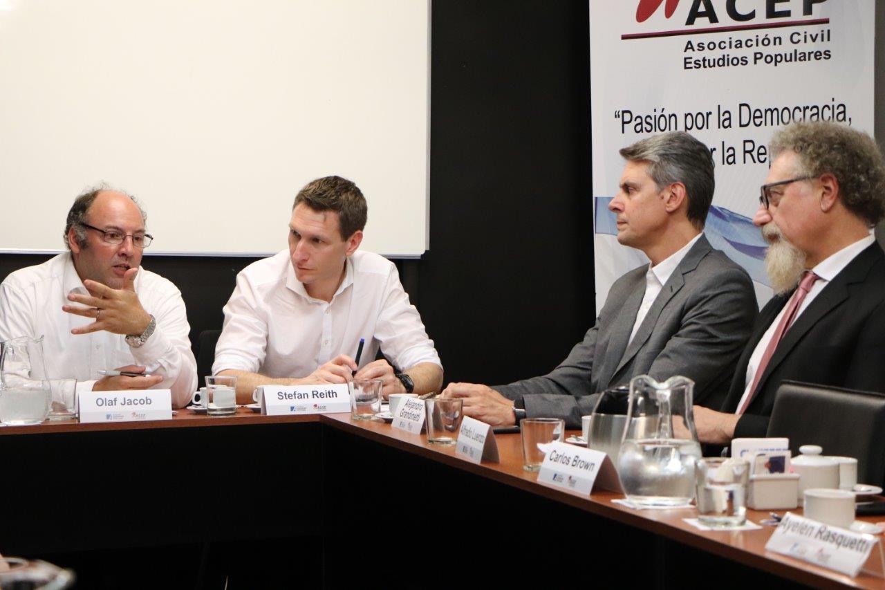 El Sr. Reith se reunió también con representantes del ACEP y senadores y diputados de la oposición, entre ellos Alfredo Luenzo, Silvina Frana, Alejandro Grandinetti, Daniel Arroyo, Marco Lavagna y Carlos Brown, con el fin de conocer su opinión acera de la situación económica, social y política y sus expectativas para el año electoral. Acto seguido, mantuvo una conversación con el diputado nacional y miembro de la comisión de finanzas, Eduardo Amadeo (PRO). Elemento clave de la conversación fue la evaluación de Amadeo de la situación del país, así como la cooperación de la KAS con la ONG “Observatorio Social”. El 15 de marzo Stefan Reith conoció a los representantes de las asociaciones juveniles “JPRO”, Michelle Taiah, y “La Generación”, María Emilia Rey Saravia. A continuación el economista Juan Luis Bour analizó las causas de la actual recesión económica y planteó sus expectativas para el año 2019. Después, los asesores políticos Carlos Fara, Jorge Dell’Oro y Carlos Germano dieron su opinión acerca de la situación actual en Argentina. Por último, el Embajador Jorge Argüello, Presidente de la Fundación Embajada Abierta, dio su punto de vista acerca de la política exterior argentina y habló de la cooperación con la KAS acerca del G20.