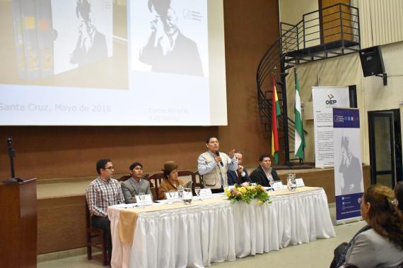 El Presidente Tribunal Electoral departamental de Santa Cruz, Eulogio Núñez Aramayo, y Ruperto Romero, director del Centro de investigación de pueblos indígenas, comentaron la traducción y su importancia para la democracia en Bolivia.